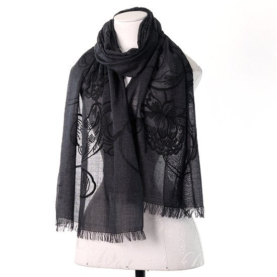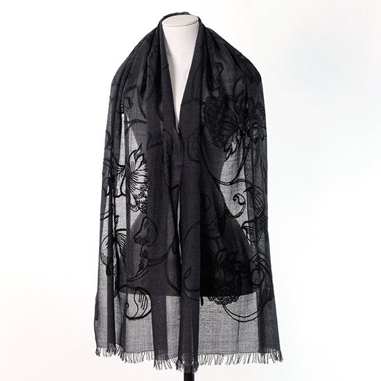 EXOTIC FLOWER 薄手ウール&シルク アリー手刺繍ストール (オフブラック/ブラック)