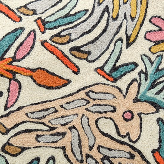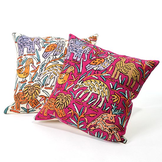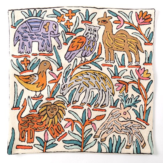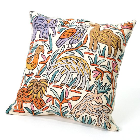 ANIMAL(アニマル)手刺繍 クッションカバー。インド北部カシミールの伝統の手工芸によるクッションカバー。ひとつ置くだけでお部屋の雰囲気をがらりと変えてくれるほどのインパクトのあるクッションカバーです。