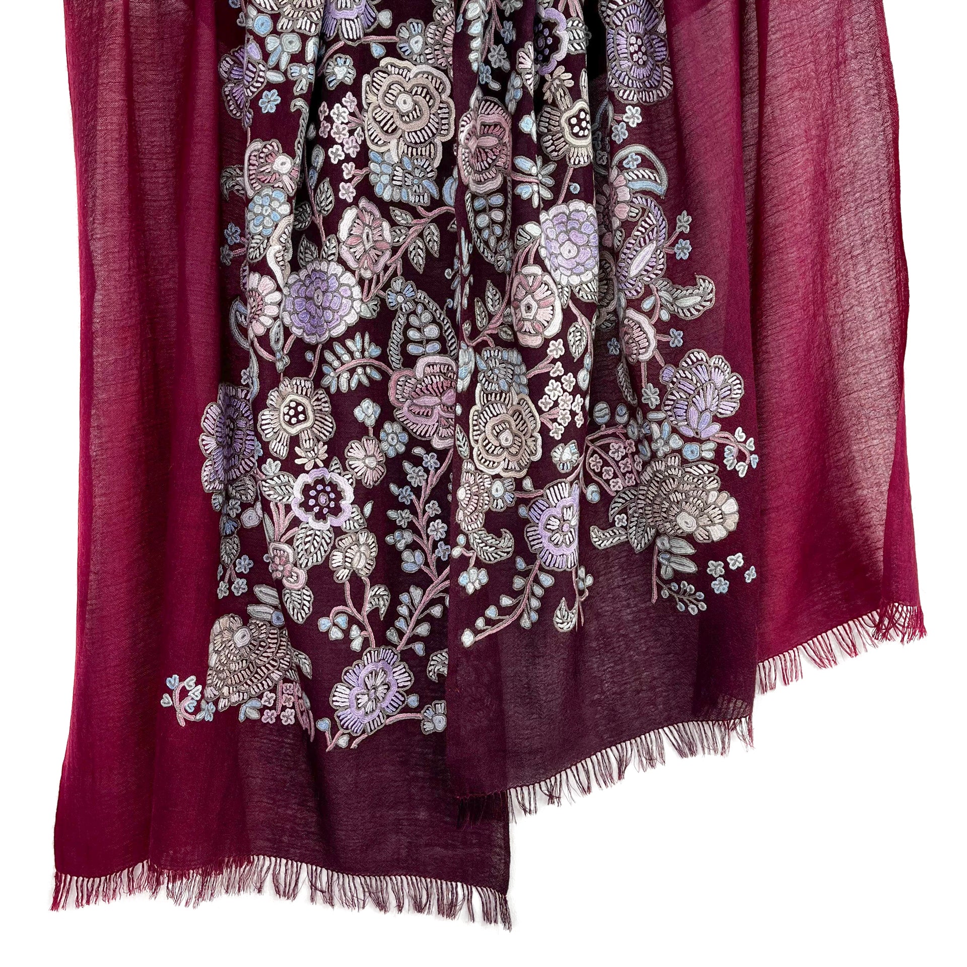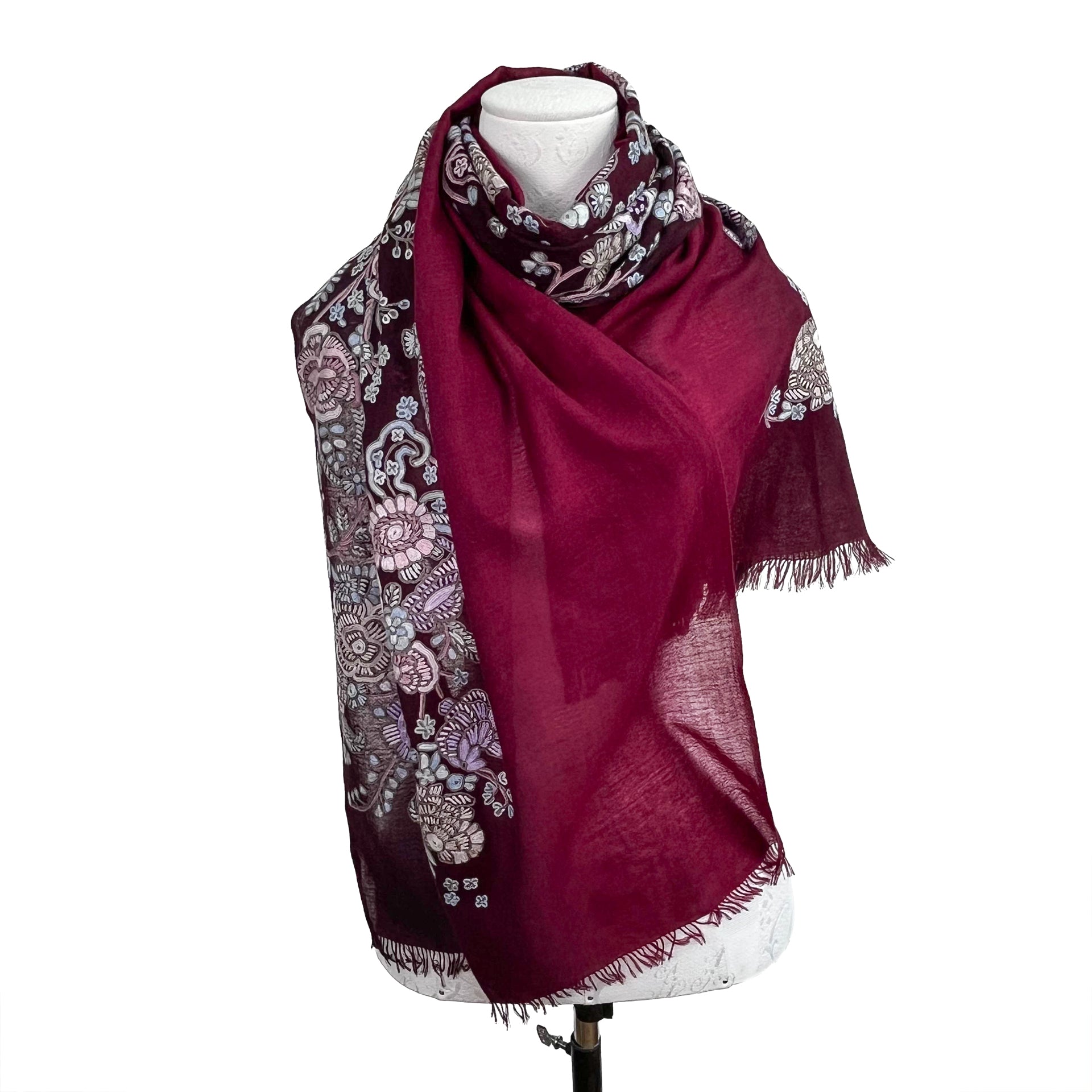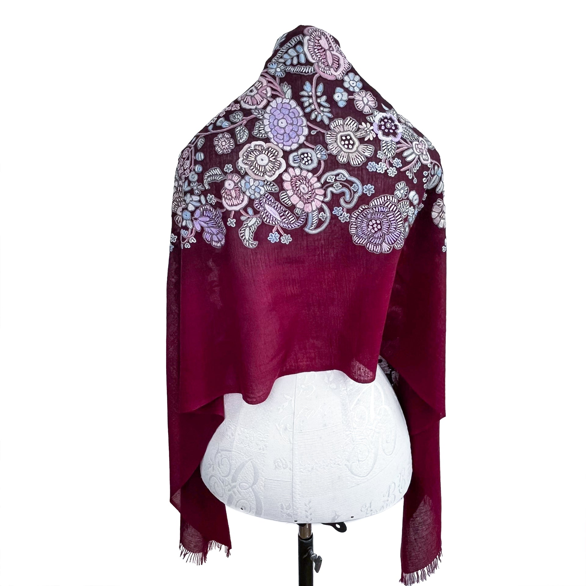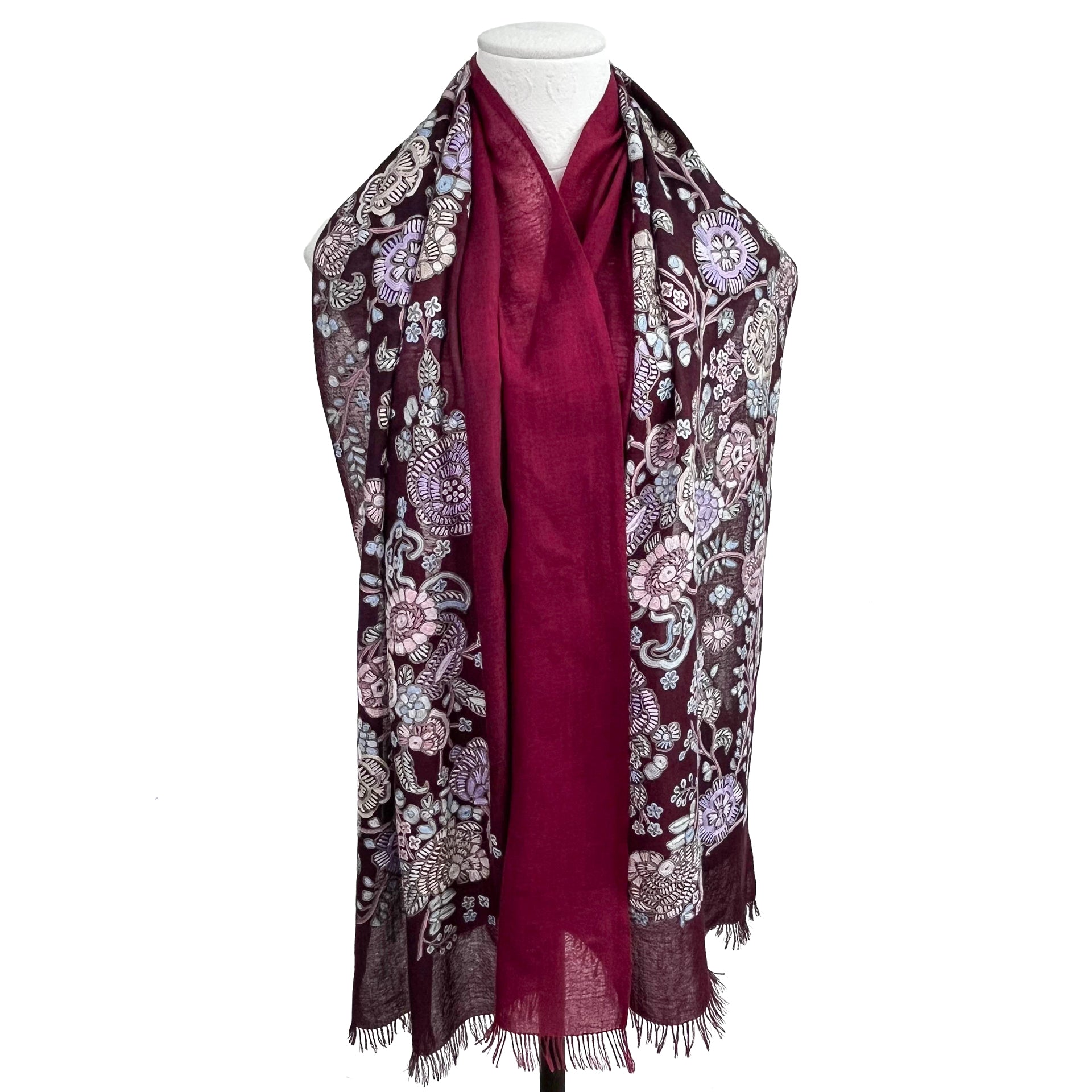Passion Flowers 薄手ウール&シルク プリント&アリー手刺繍ストール (ボルドー)