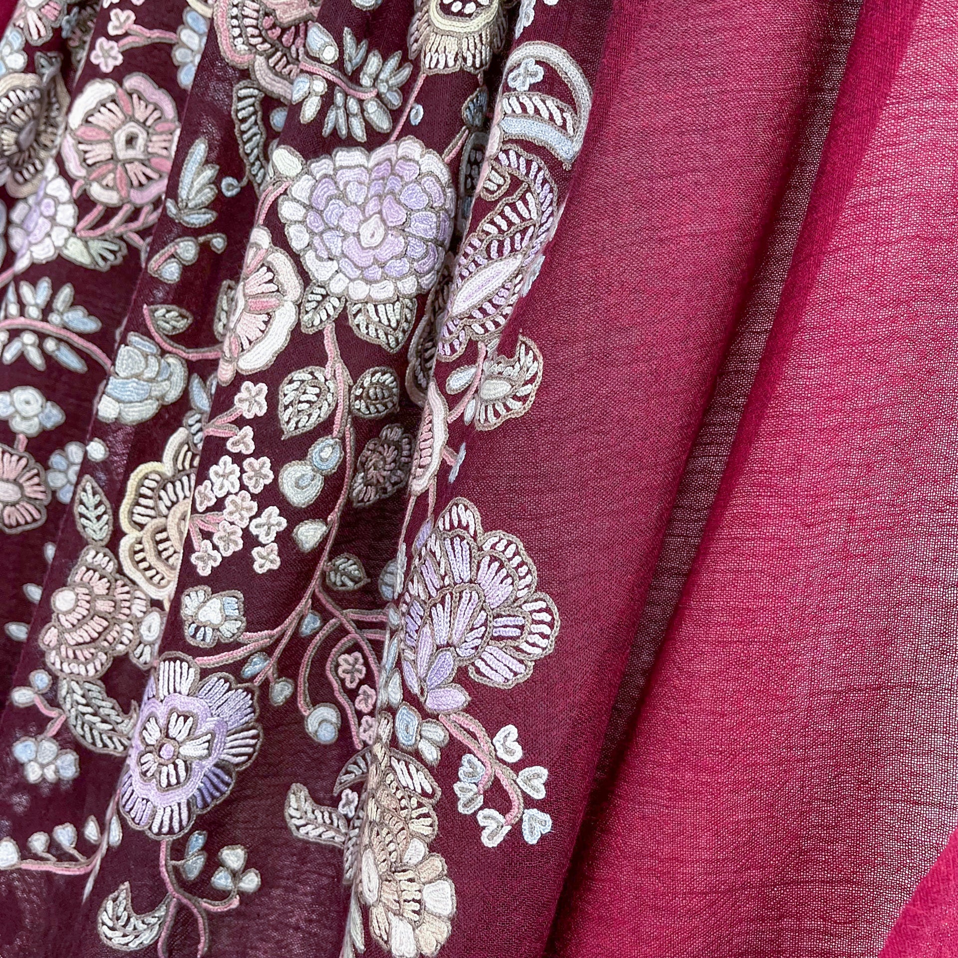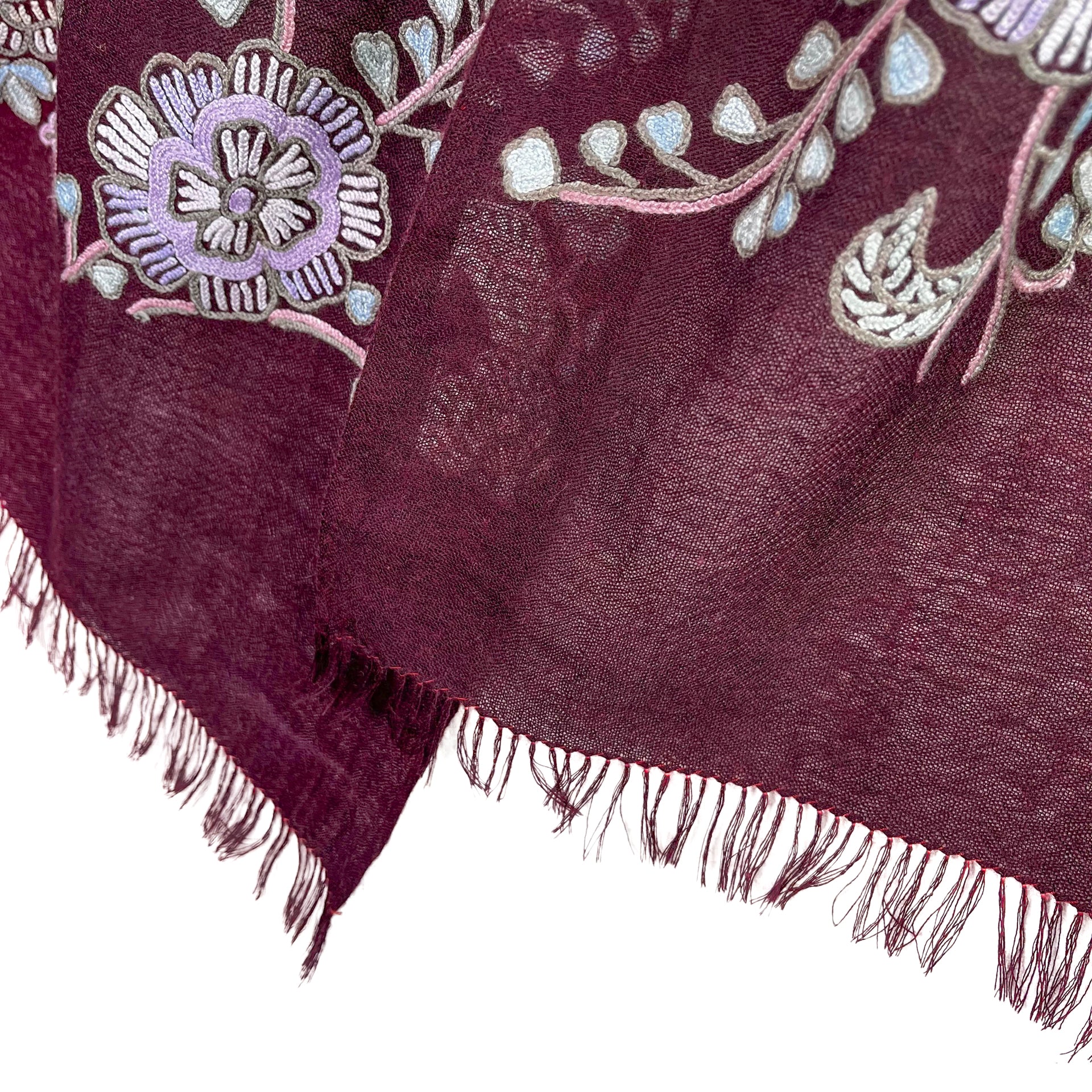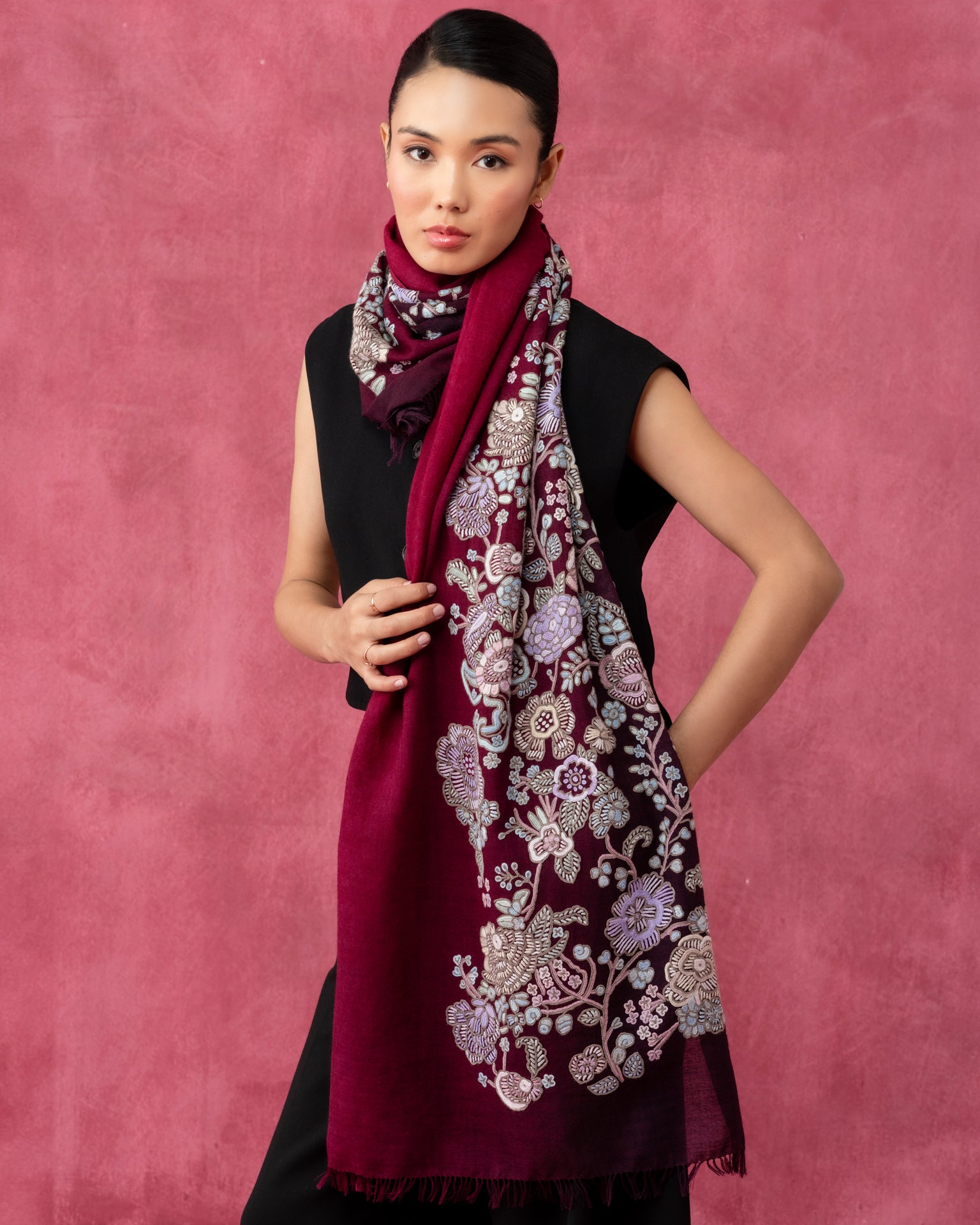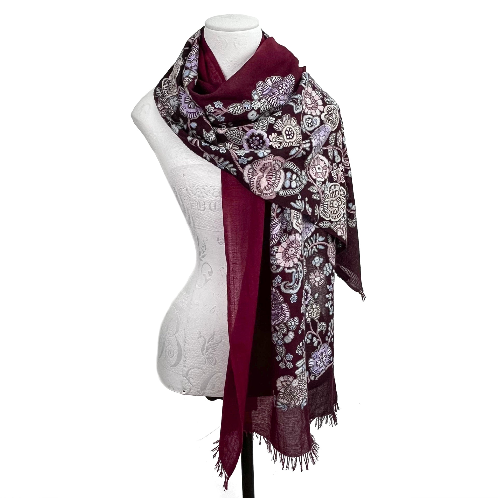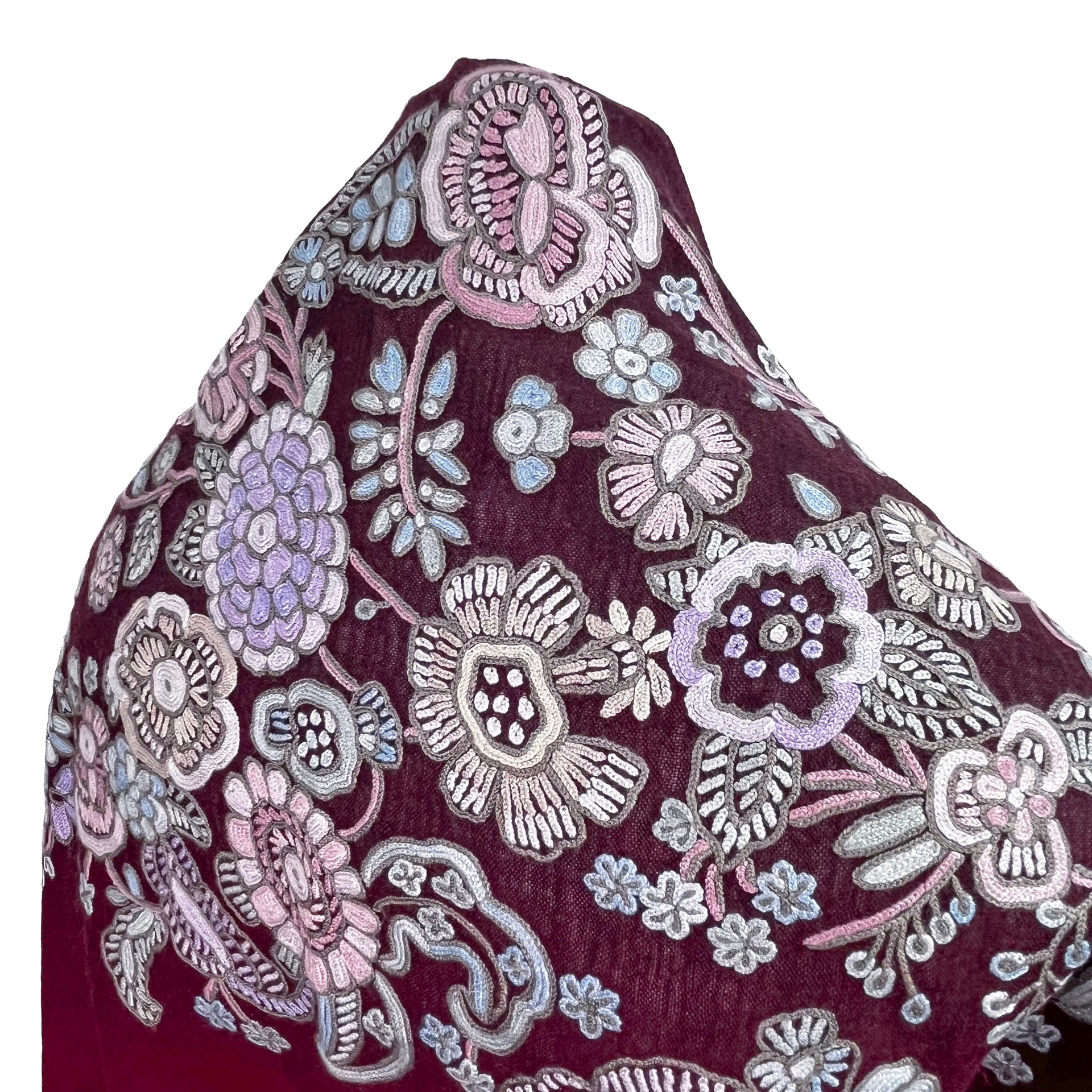 Passion Flowers 薄手ウール&シルク プリント&アリー手刺繍ストール (ボルドー)