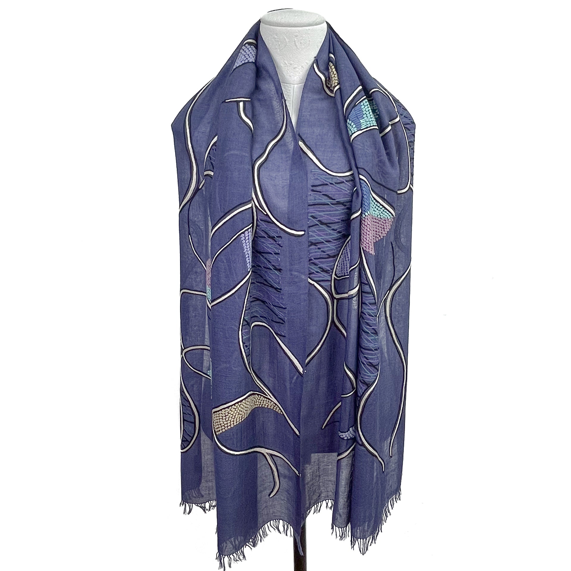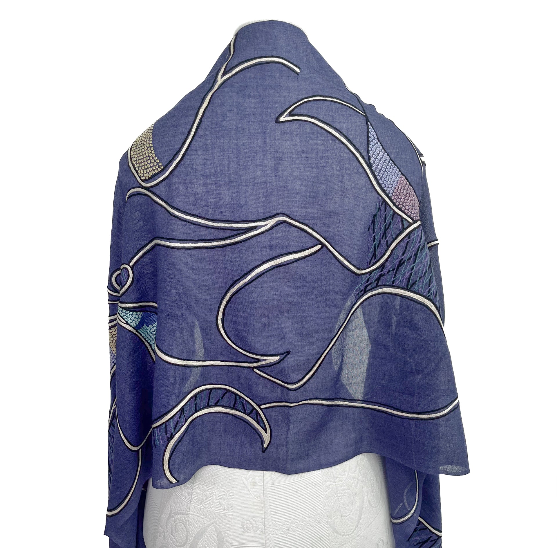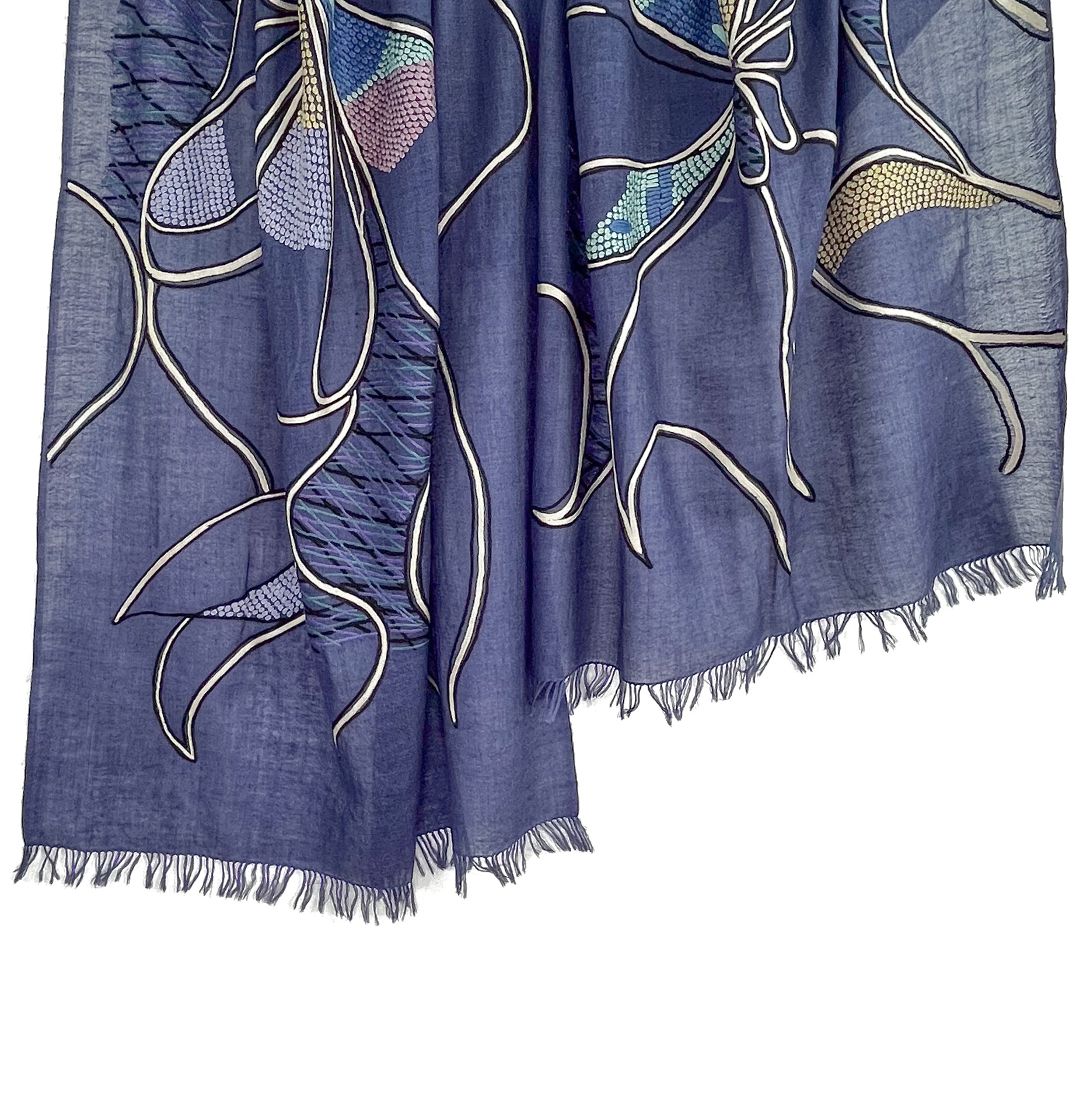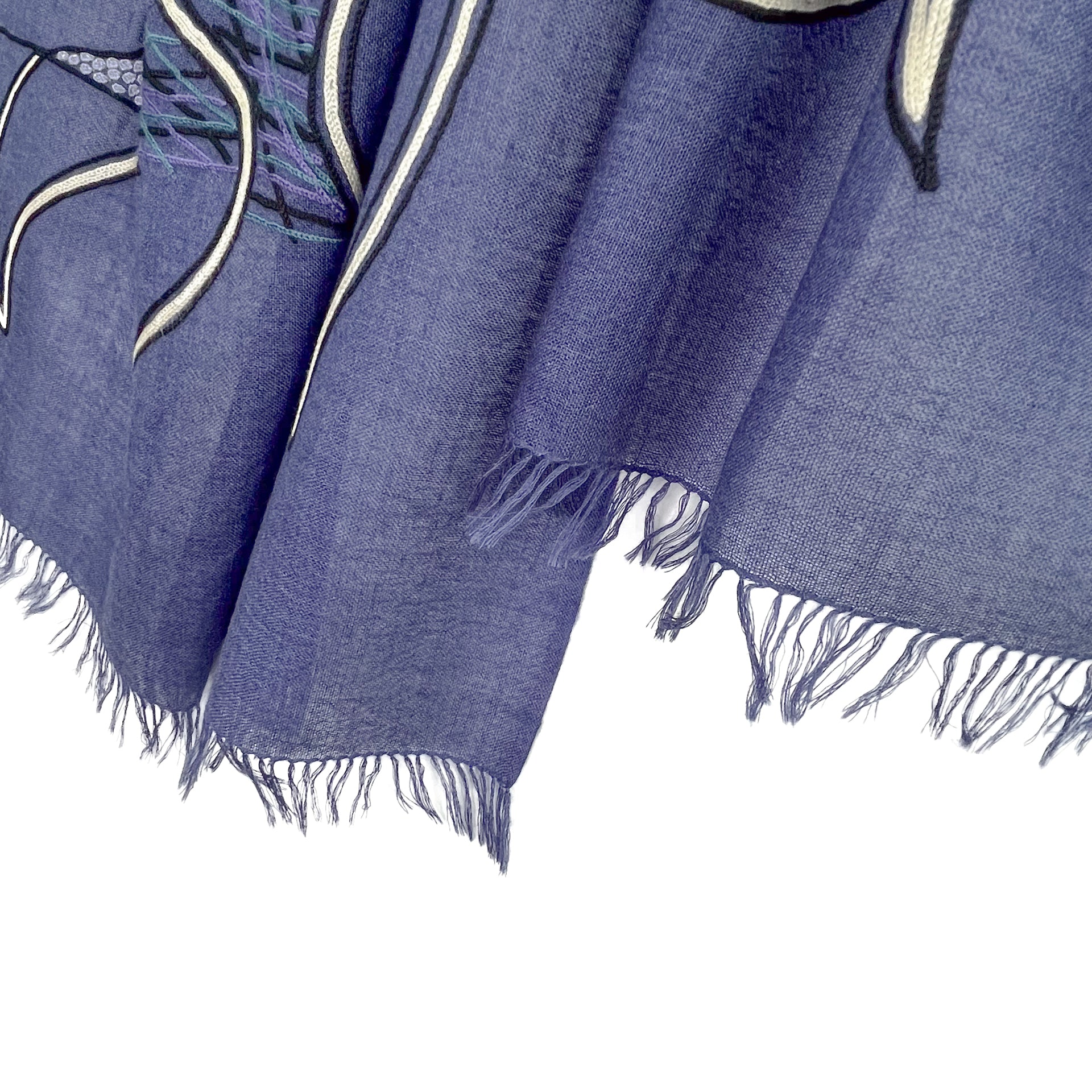 Abstract 薄手ウール&シルク アリー手刺繍ストール (ネイビー)