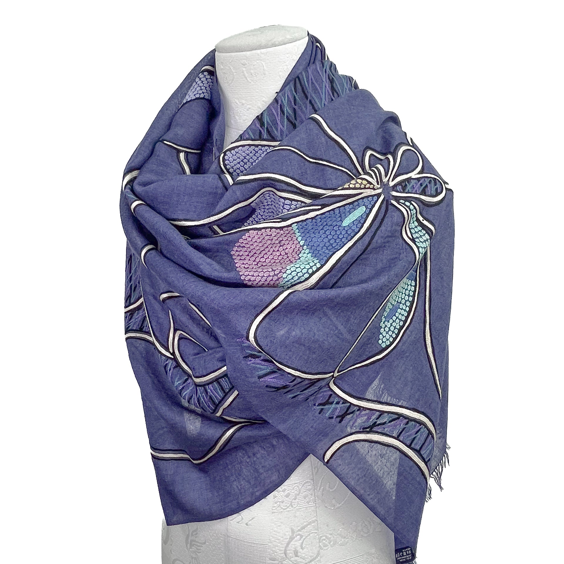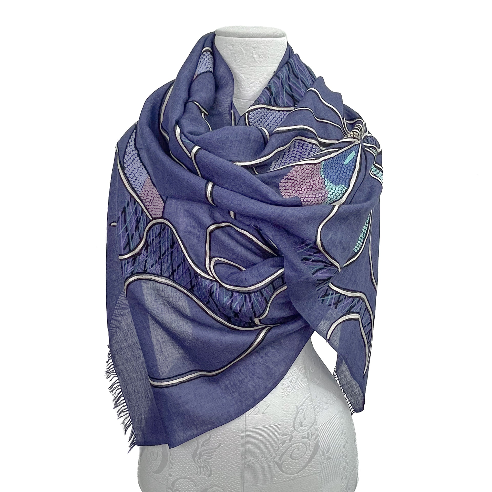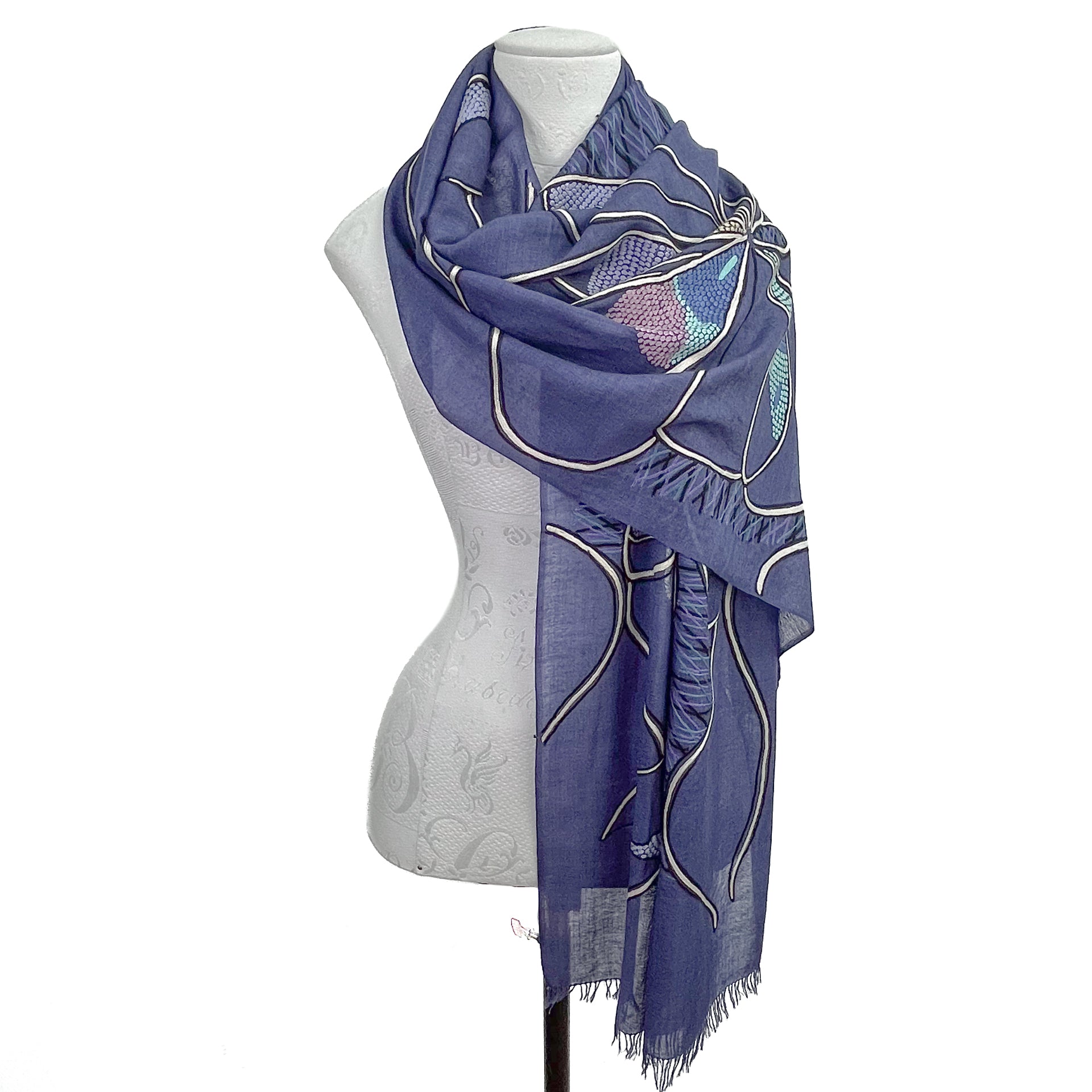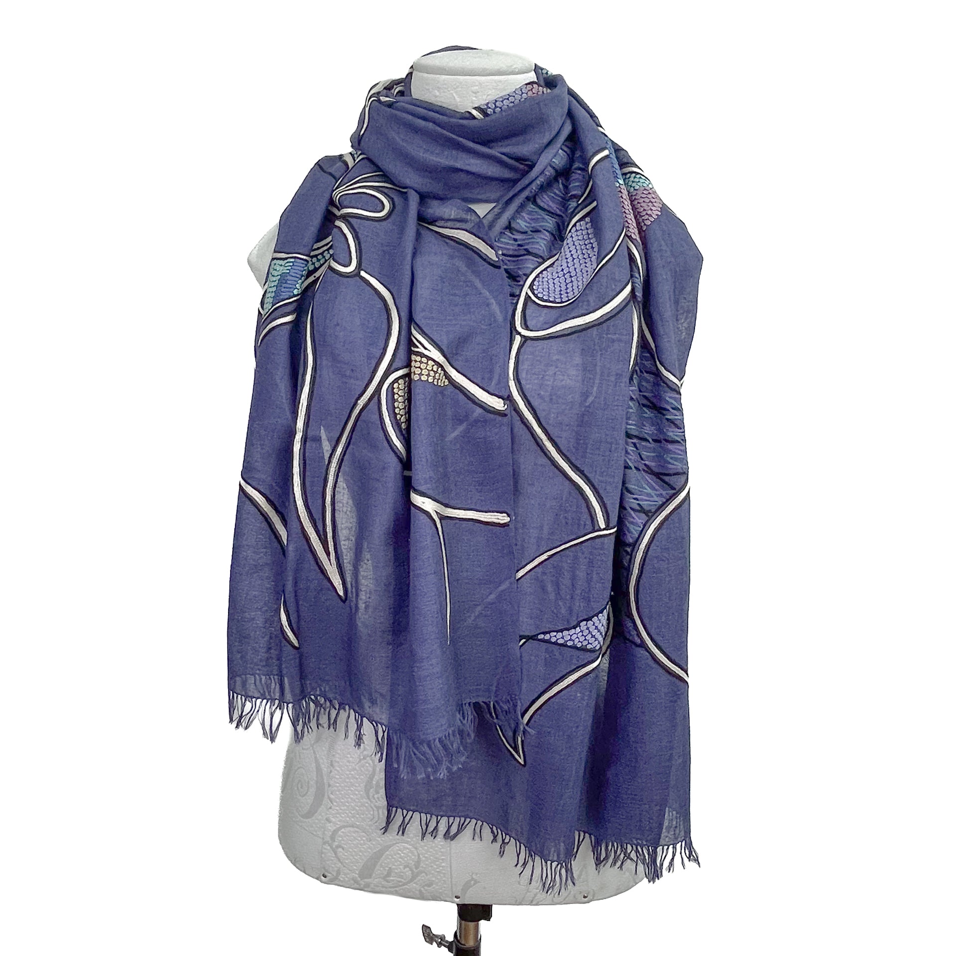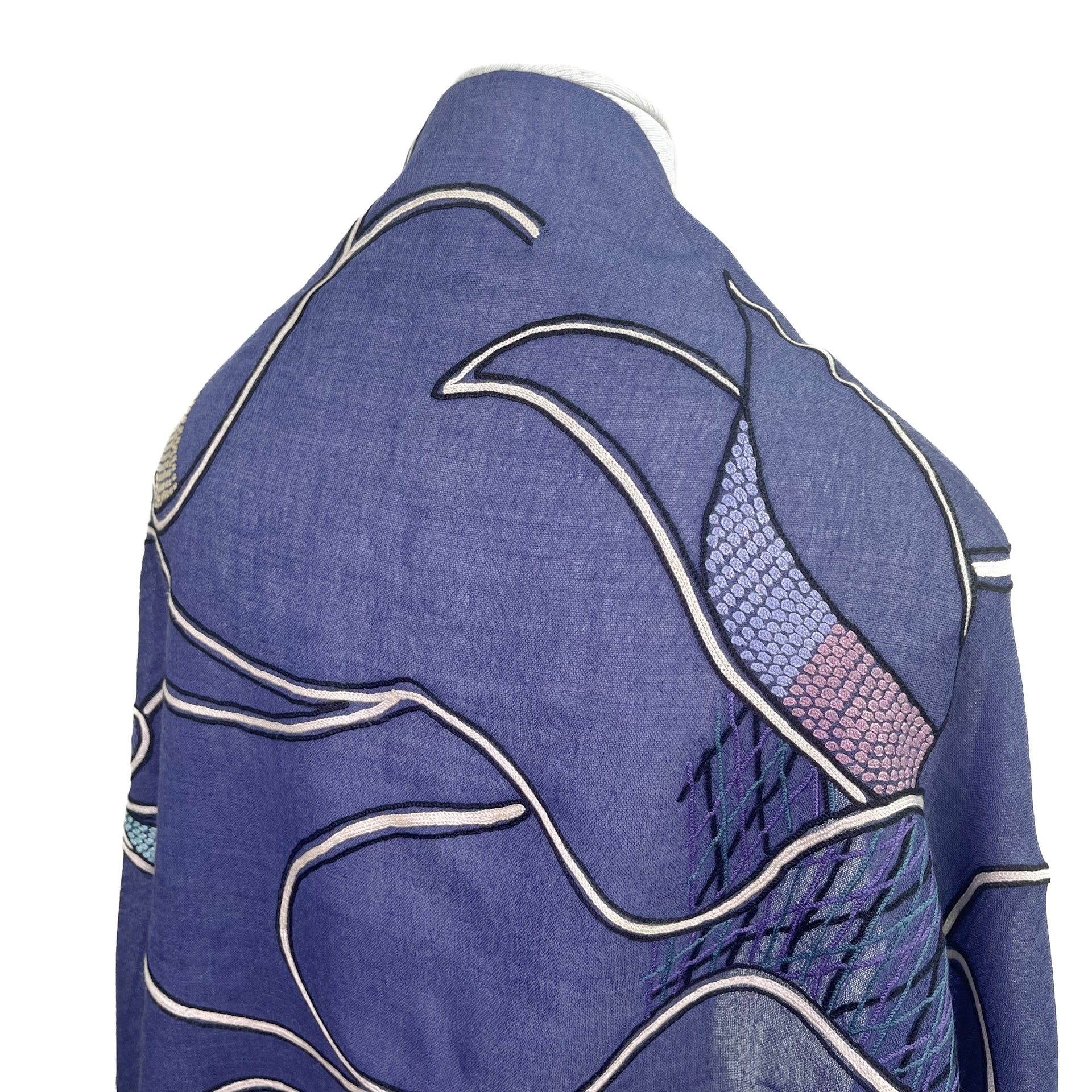 Abstract 薄手ウール&シルク アリー手刺繍ストール (ネイビー)