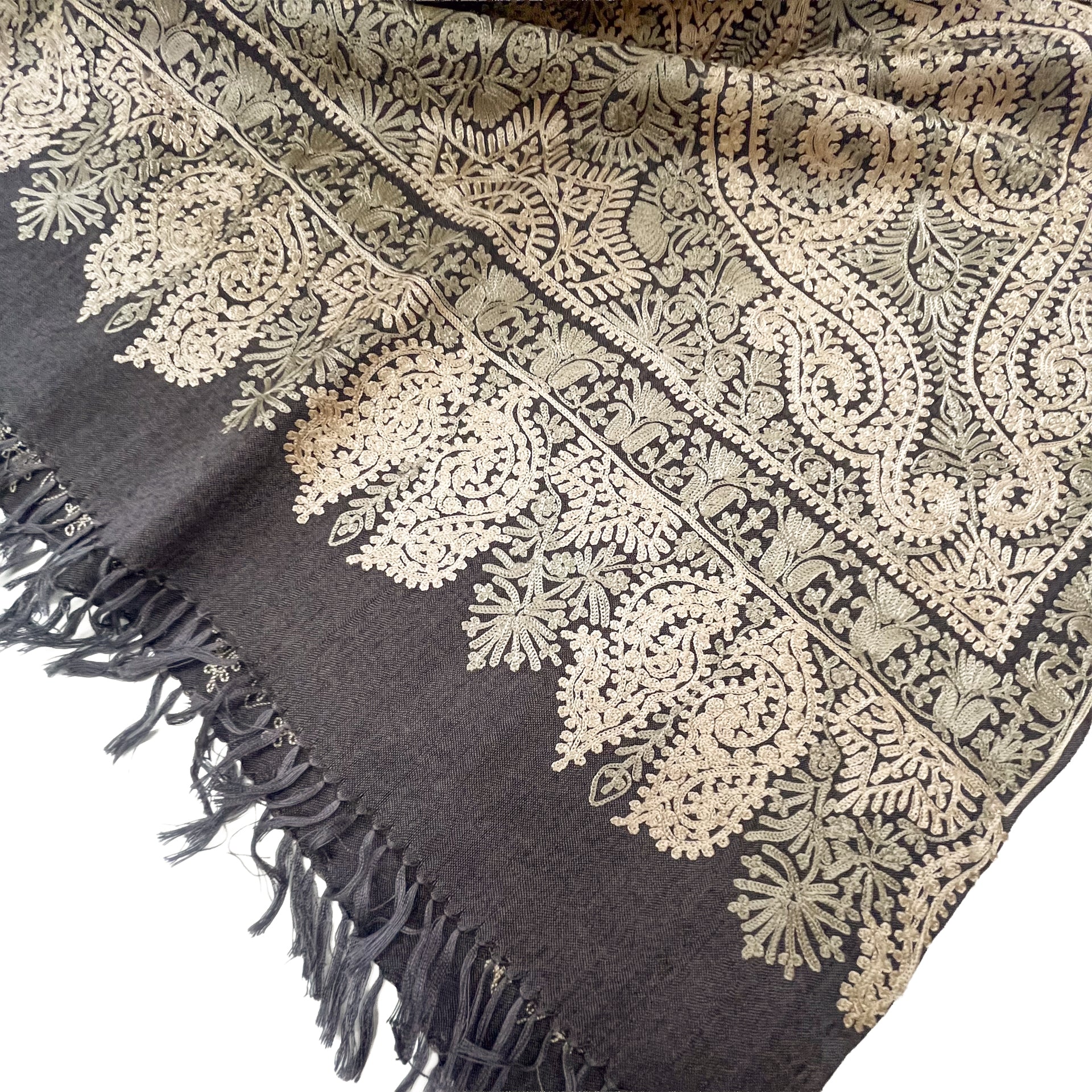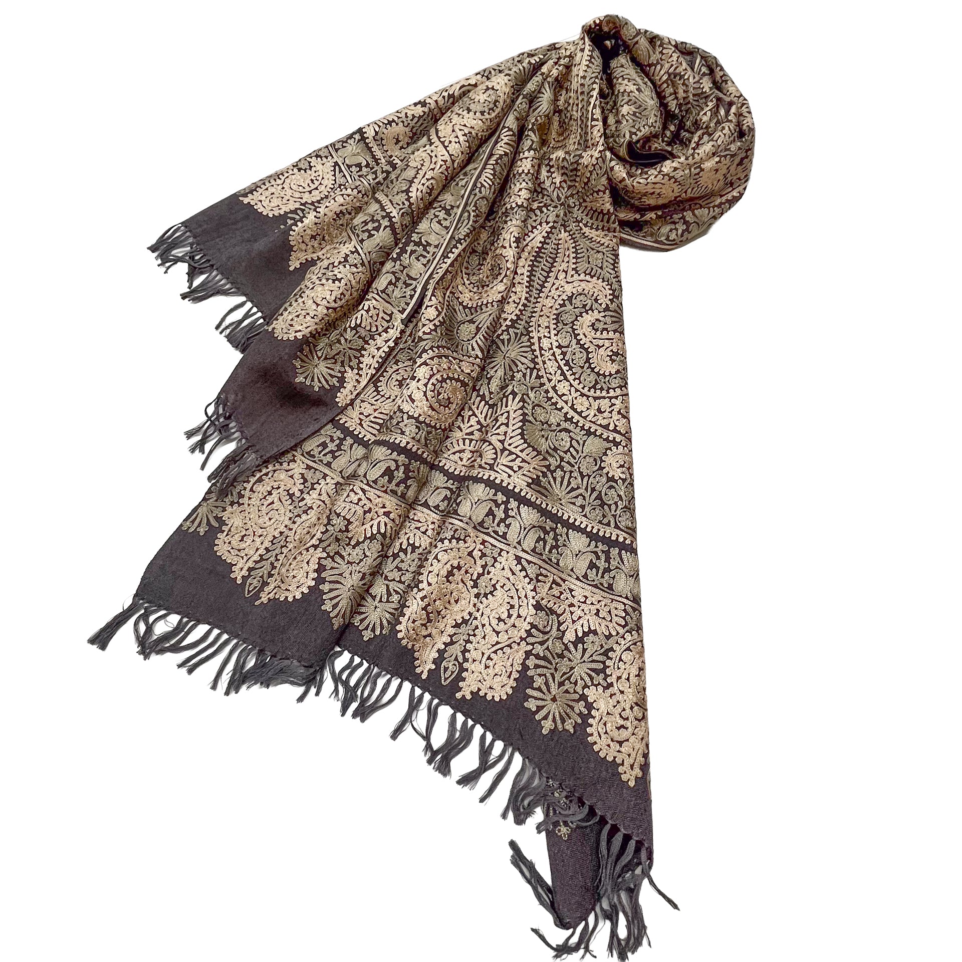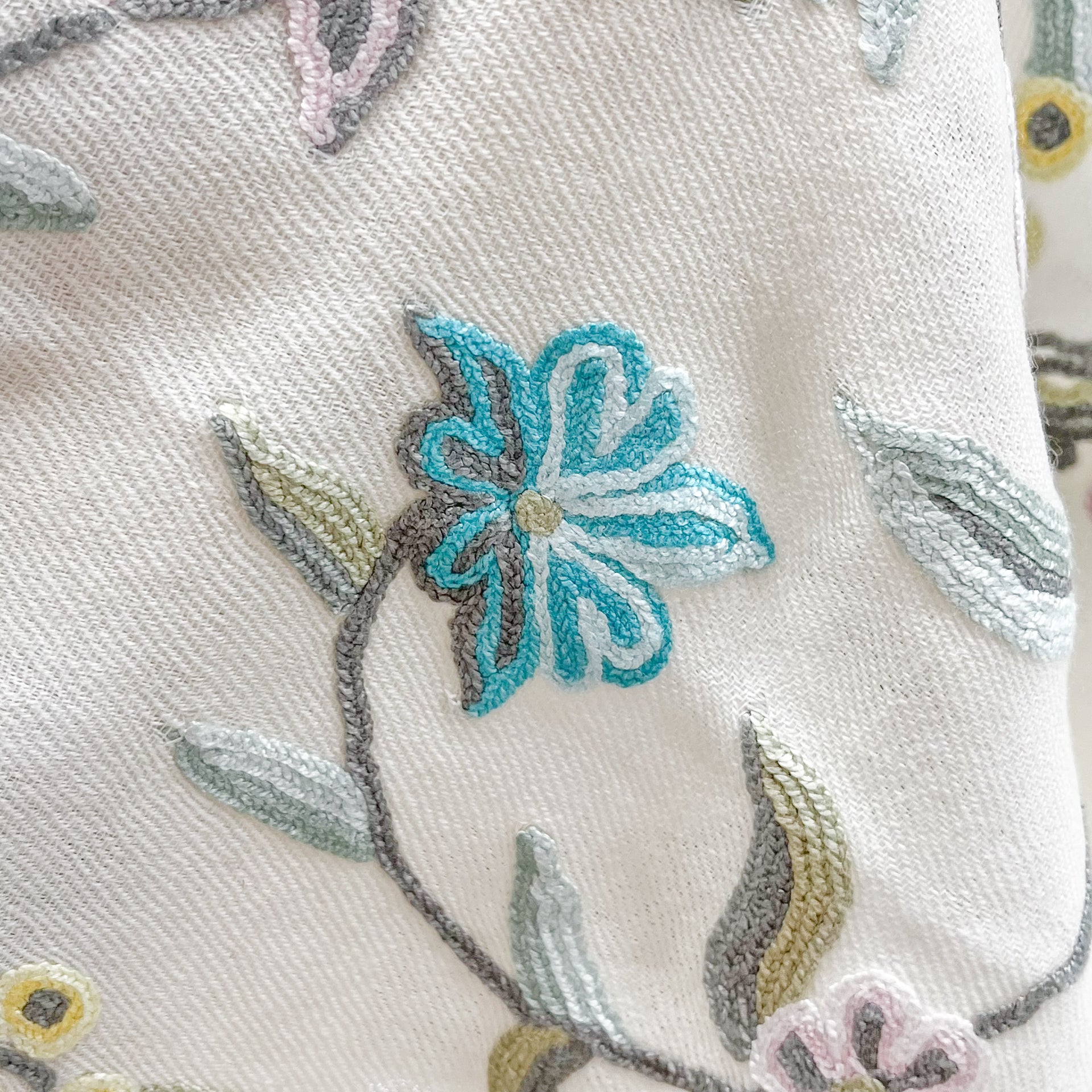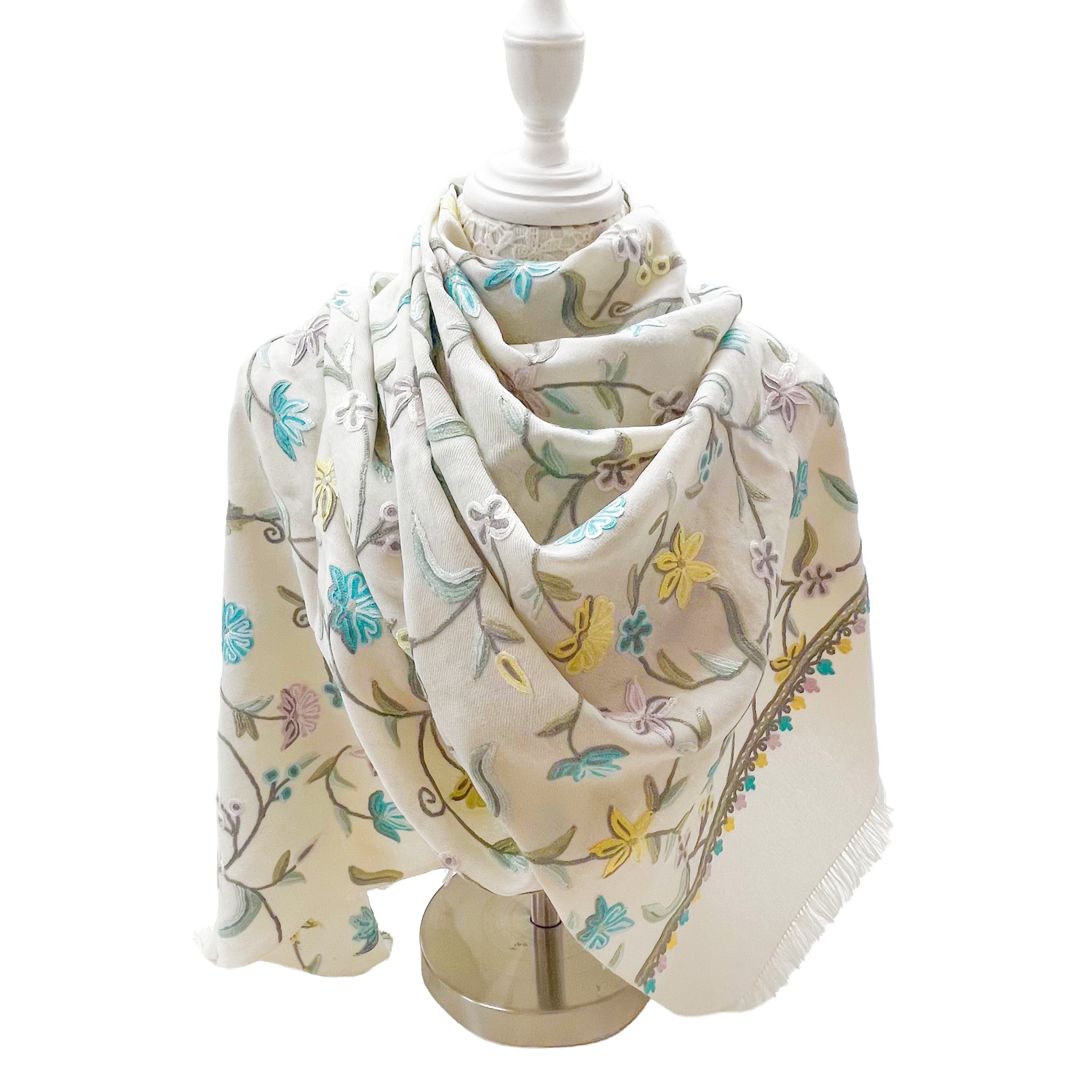 ウール素材のストールの全体にフラワーモチーフのアリー手刺繍を施したストール。ふんわり羽織って上着がわり、首元にくるりと巻いて防寒に、オンタイムにもオフタイムにも使いやすいストールです。旅行の際にも重宝します。