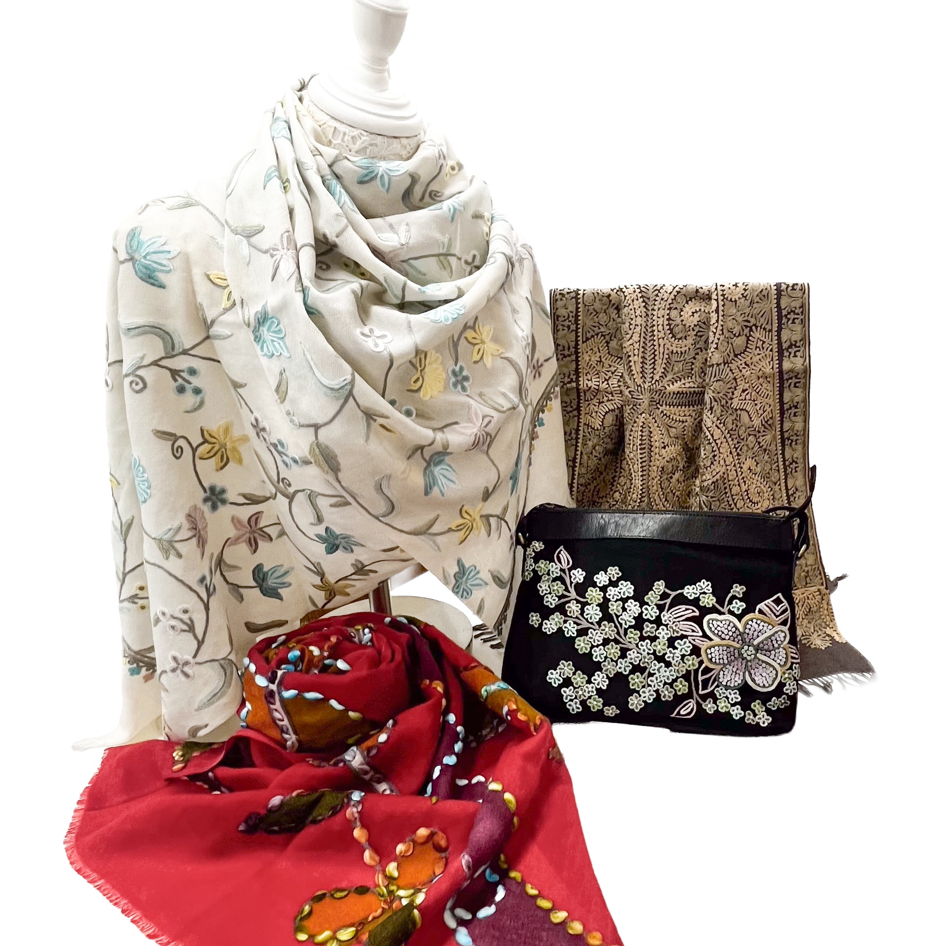 2026HappyBag 5万円 <ウール アリー手刺繍ストール1点+ウールシルクマシン刺繍ストール1点+ウール毛糸手刺繍ストール1点+アリー手刺繍 ショルダーバッグ1点セット>1点限定のご提供です。(完売の際はご容赦ください。)