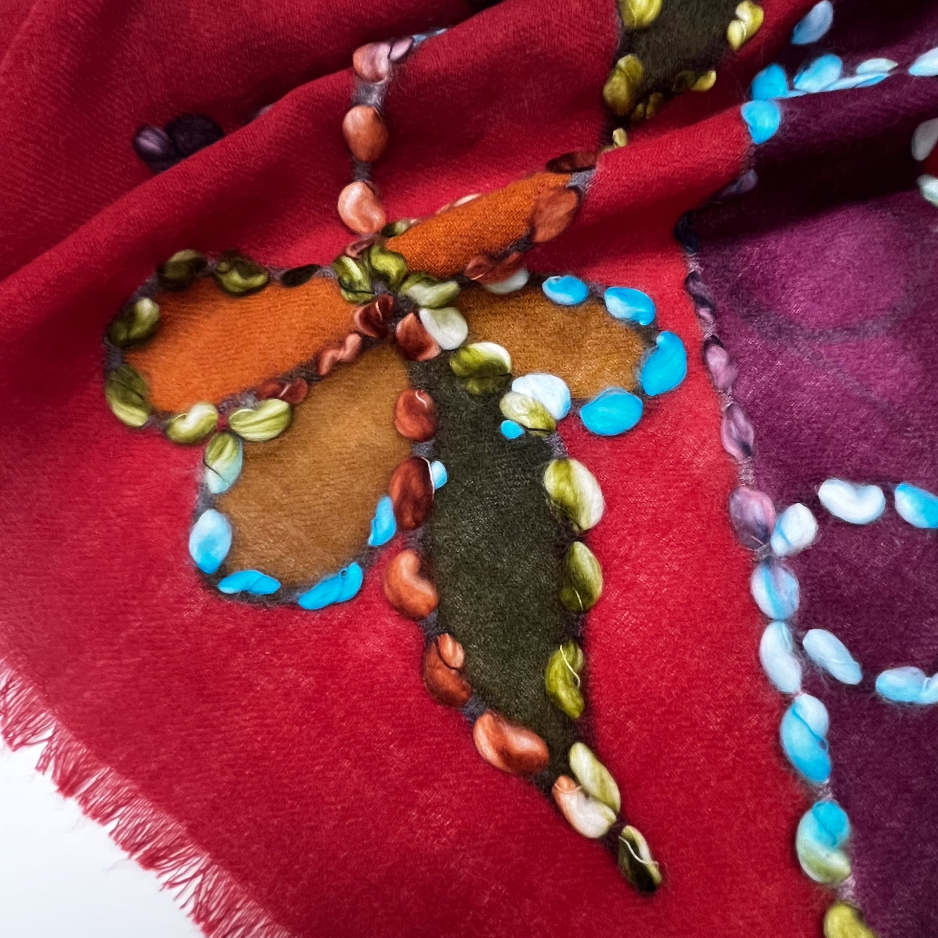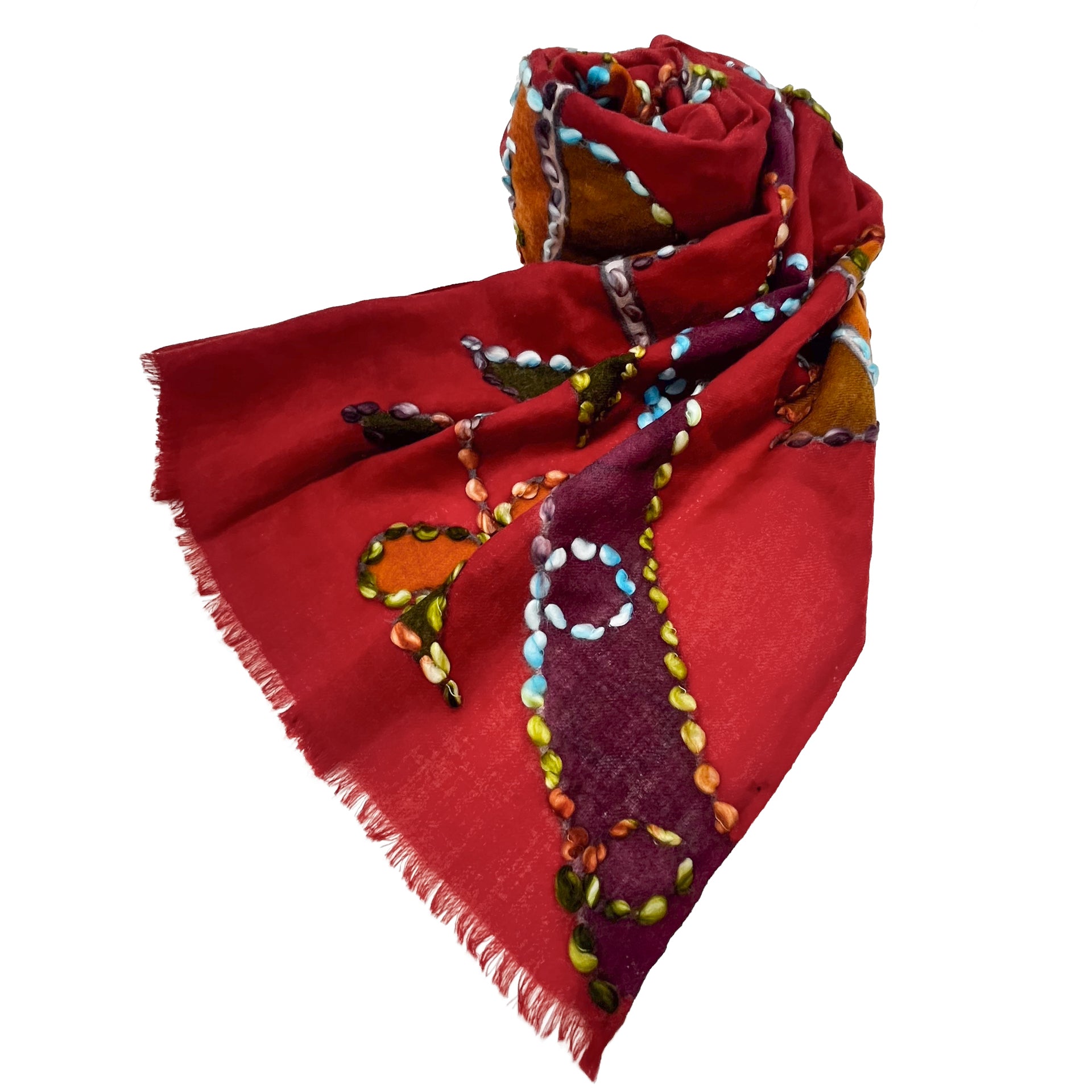 ウール100%  刺繍糸:レーヨン100% 60x184cm(フリンジを除く) 原産国:インド