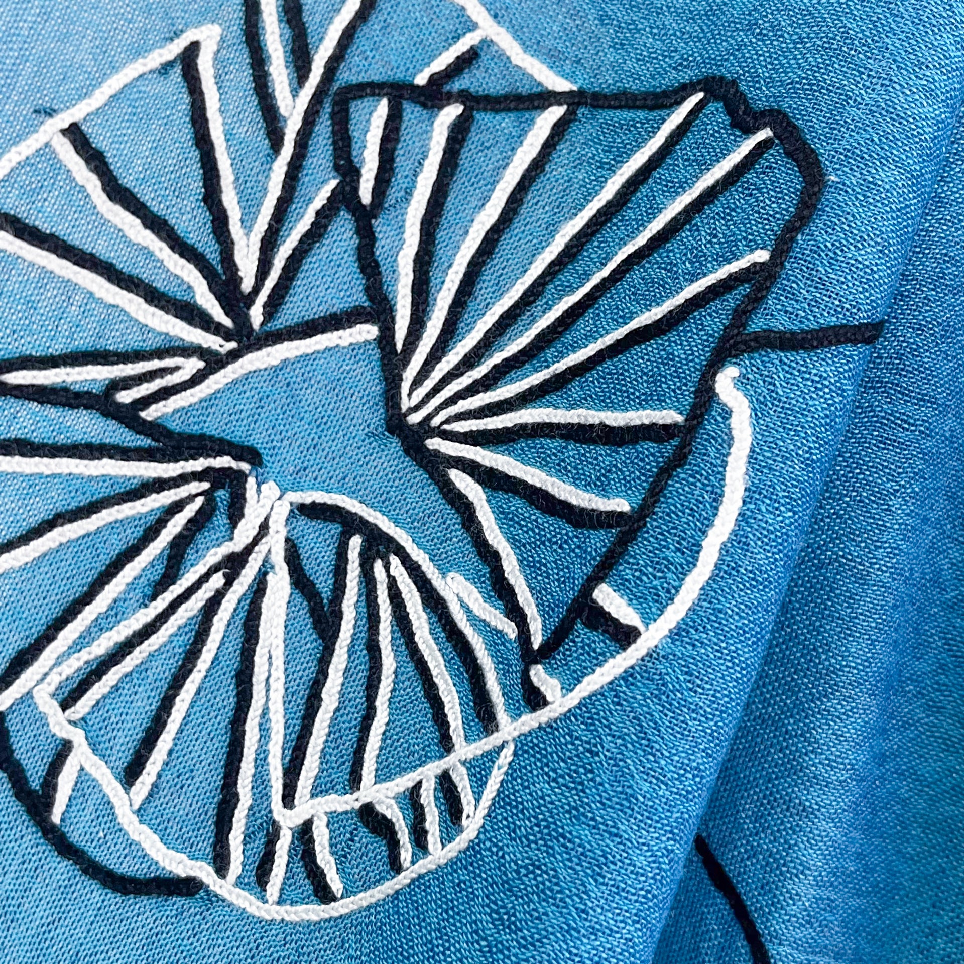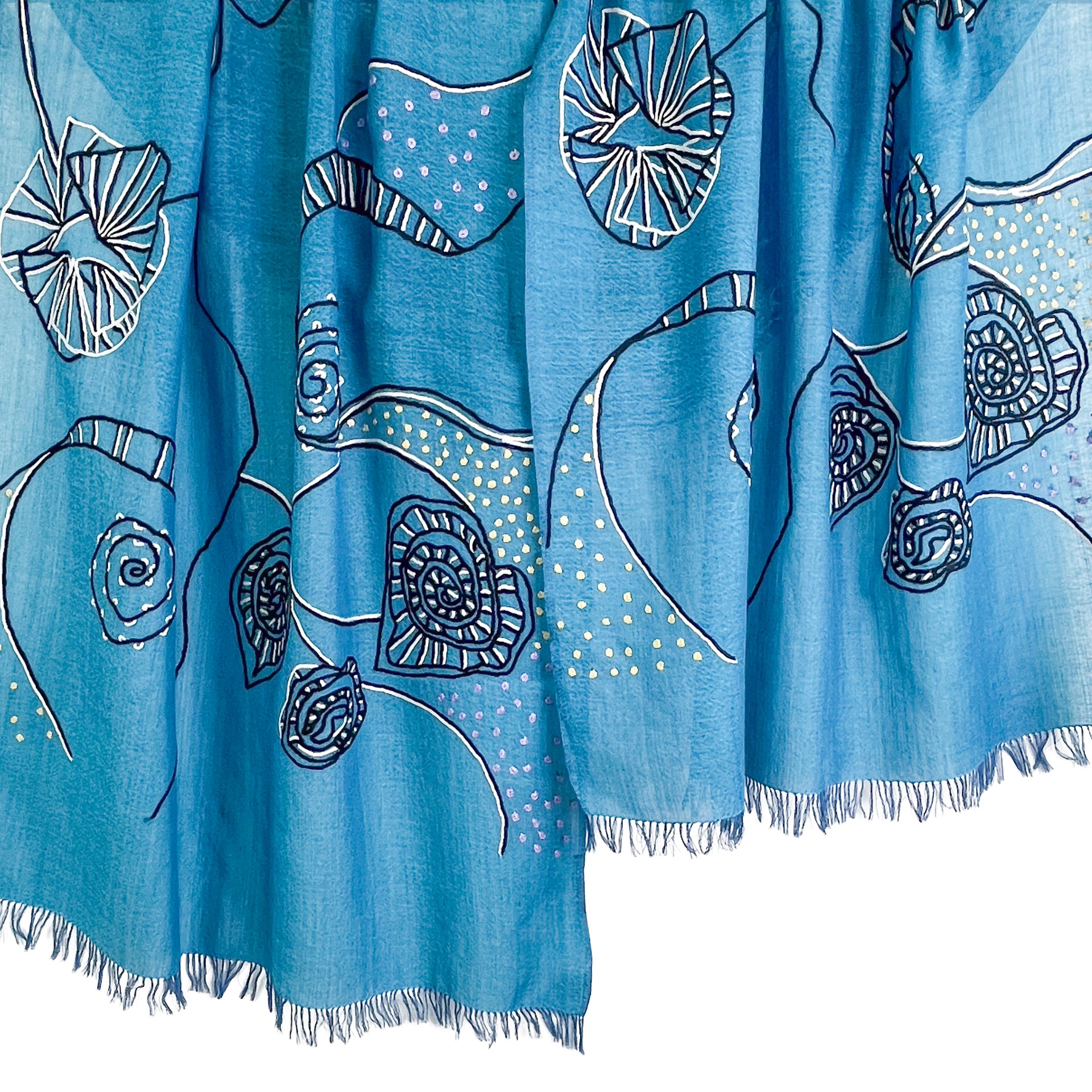 アリー手刺繍で表現したアンモナイトの殻のように渦を巻いたグラフィックと、抽象的なフラワーモチーフが印象的なストール。
