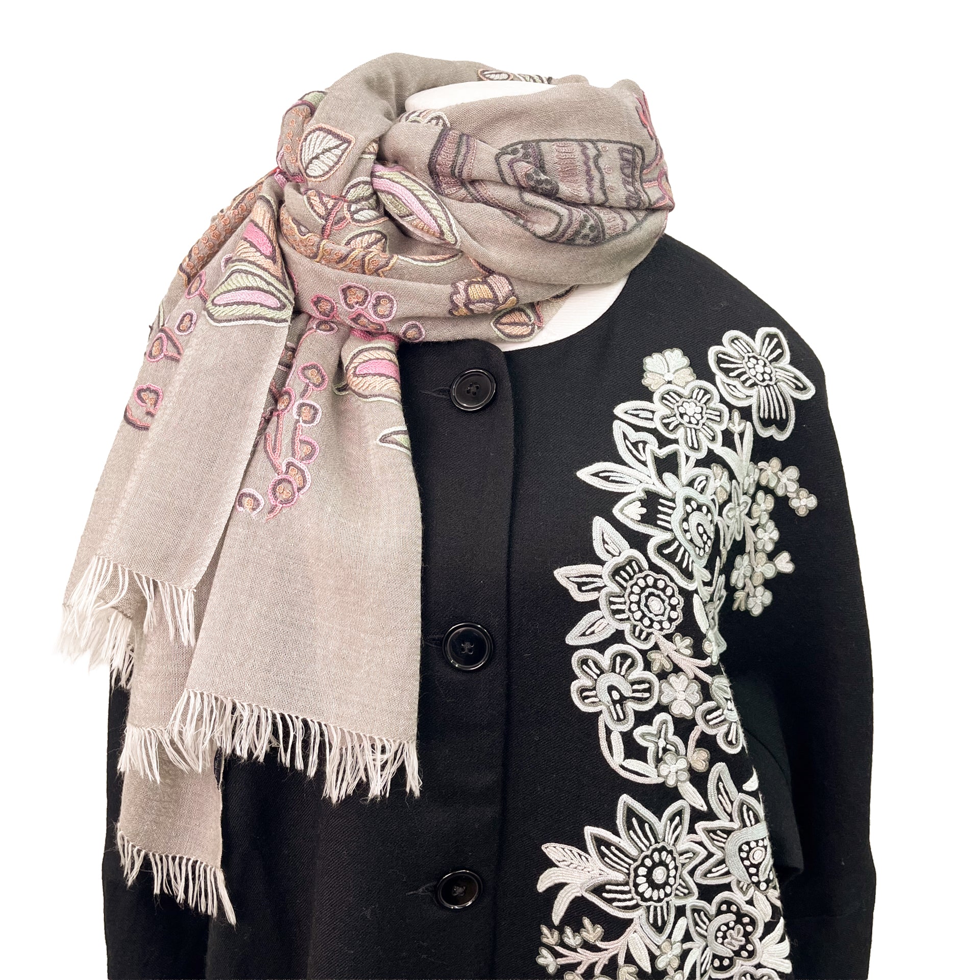 S-WTA5003_0162FLOWER POT ウール&シルク アリー手刺繍ストール (グレージュ)
