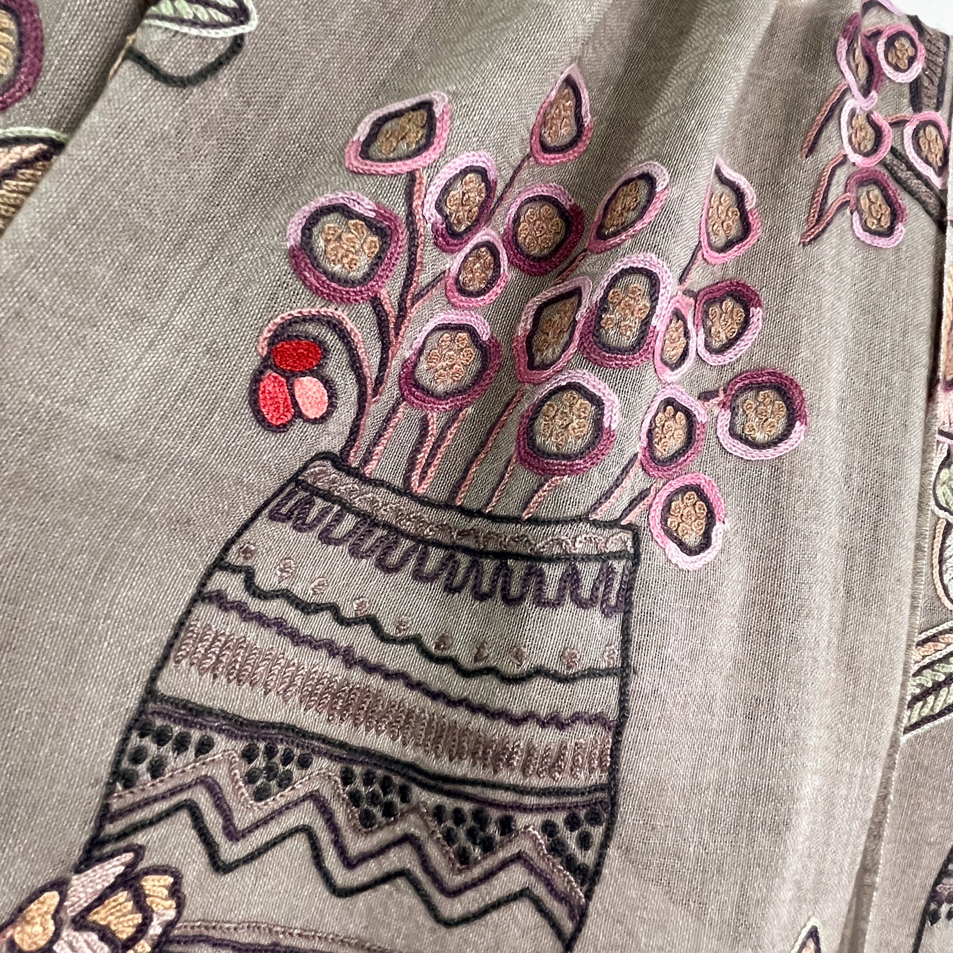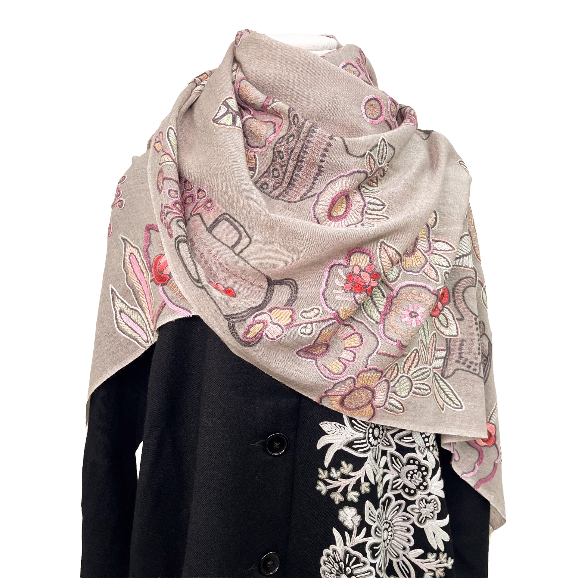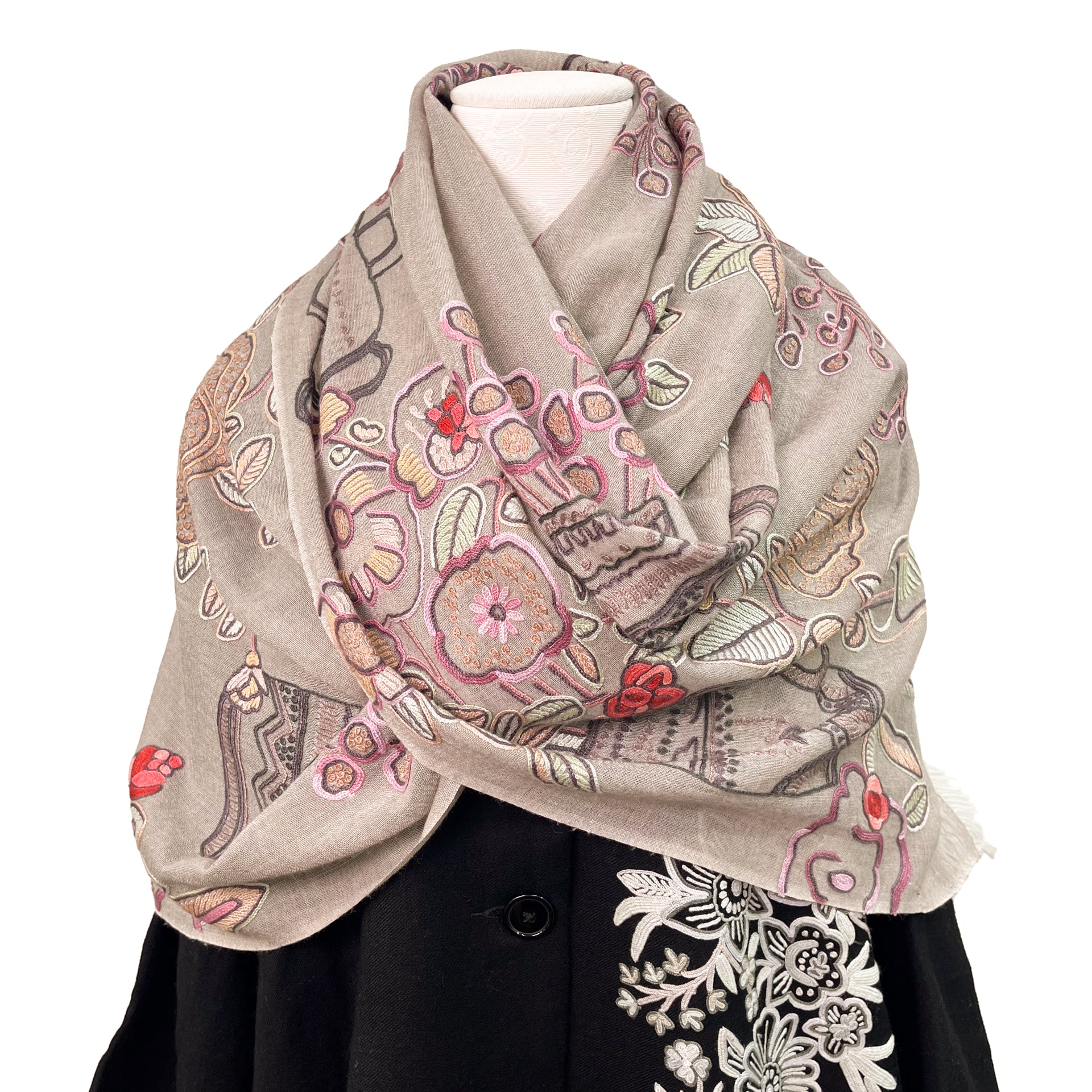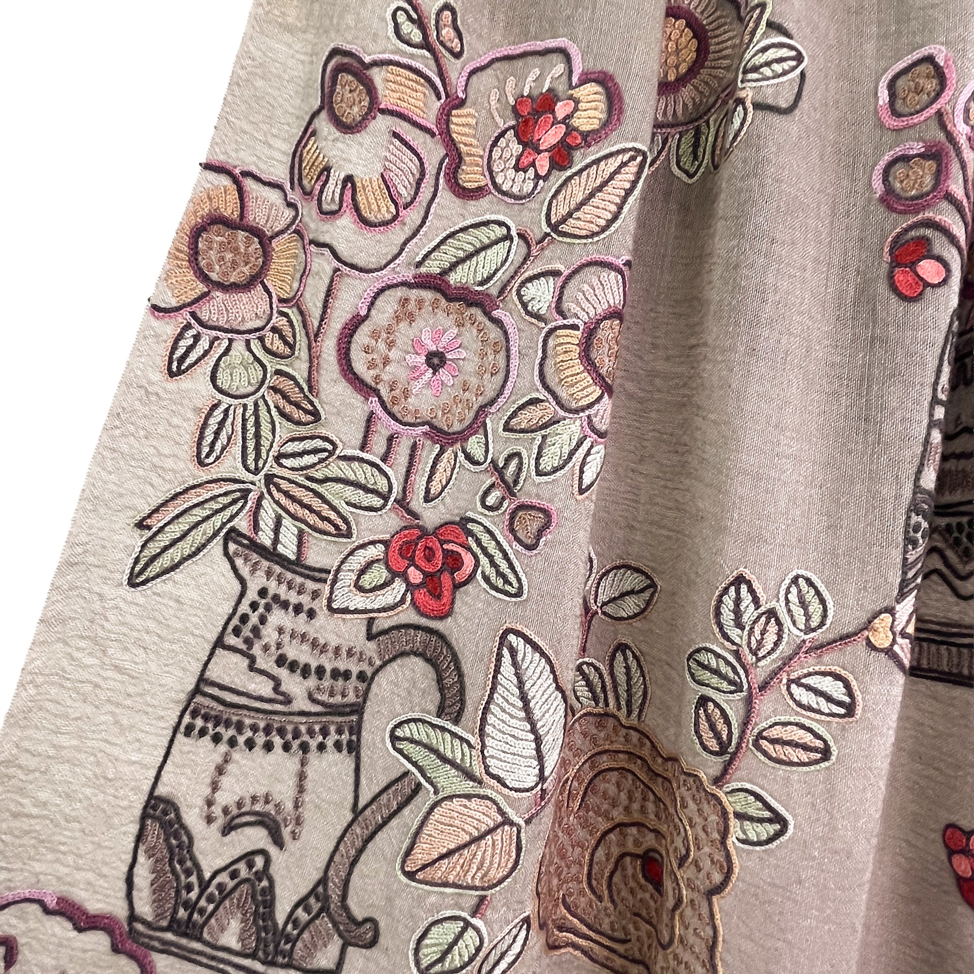 FLOWER POT ウール&シルク アリー手刺繍ストール (グレージュ)