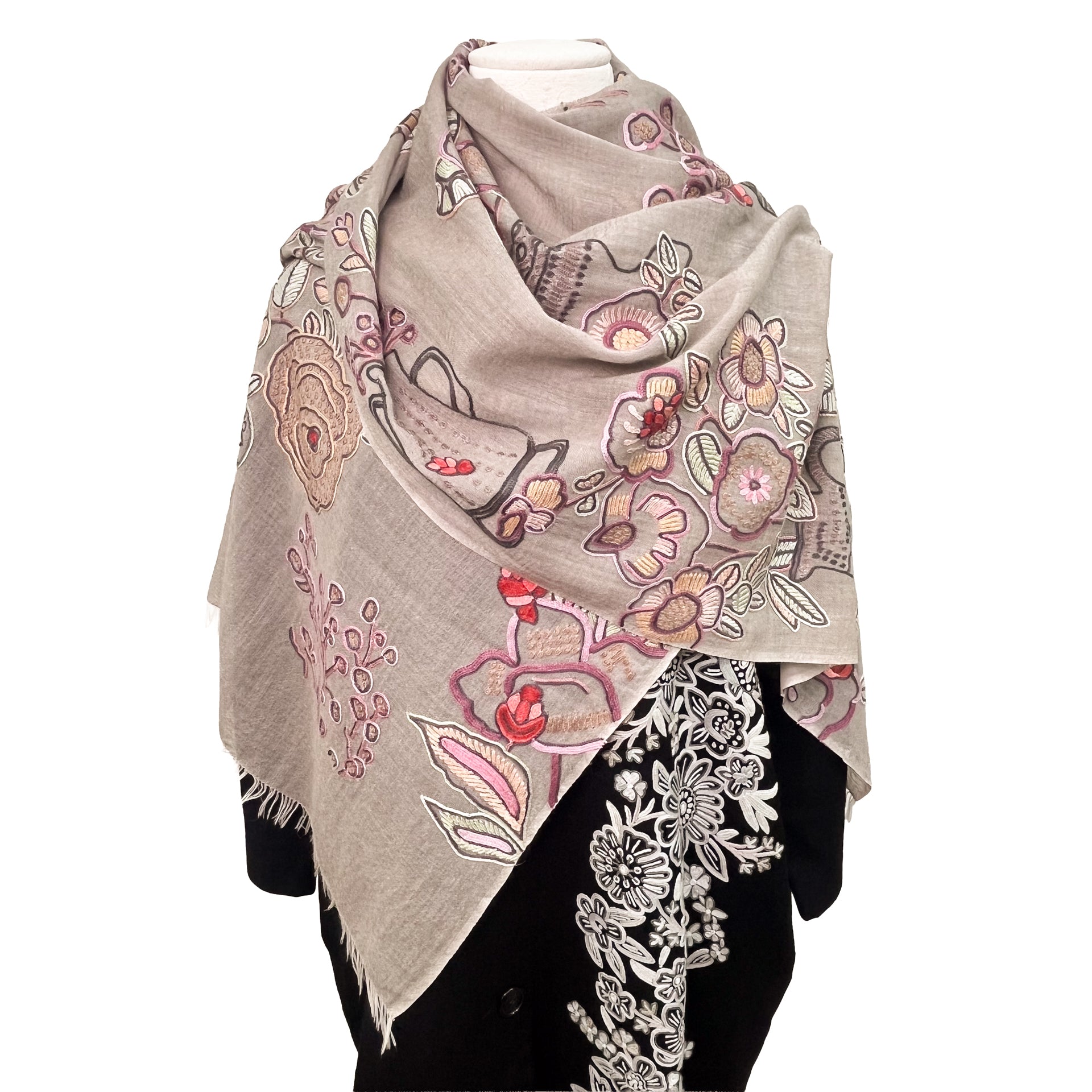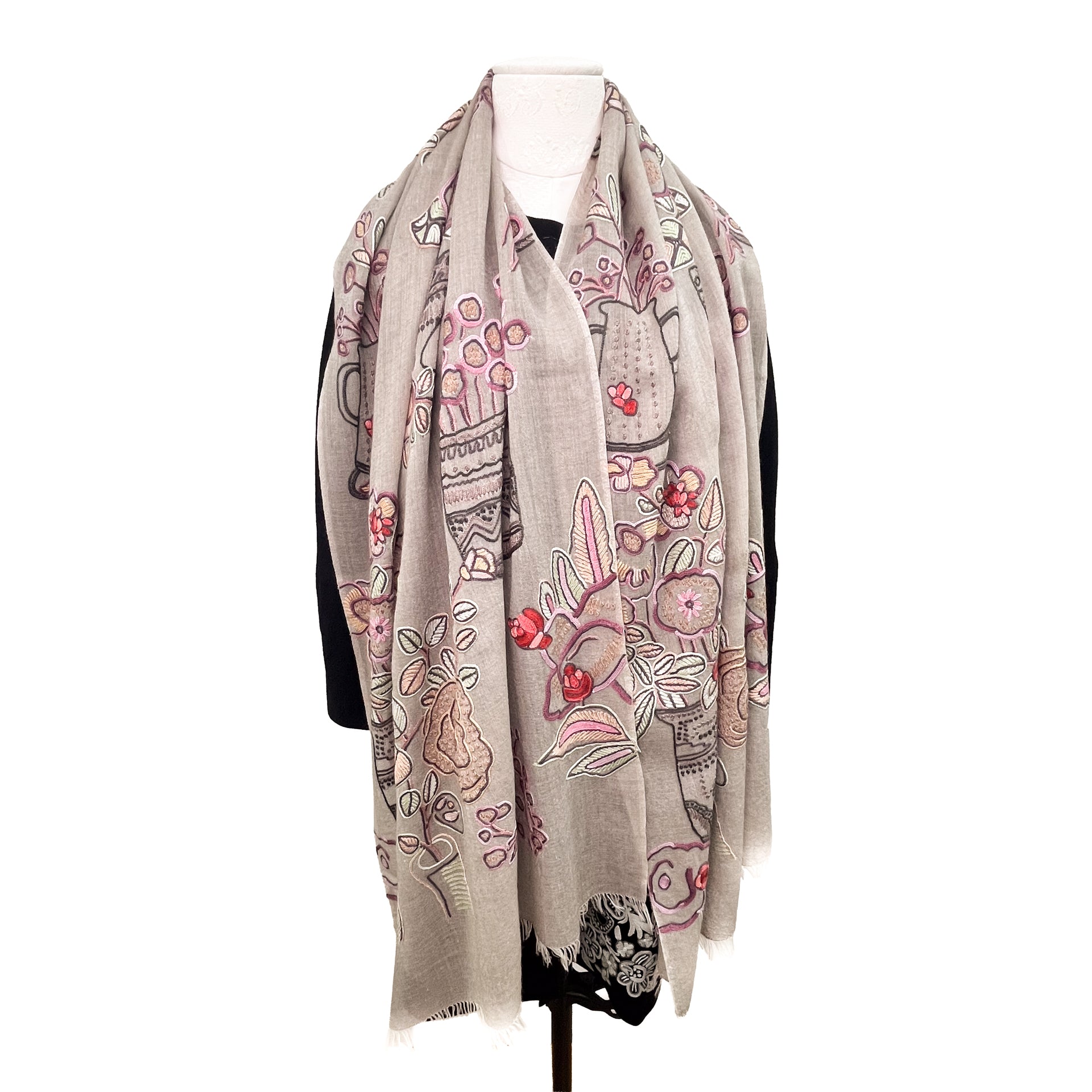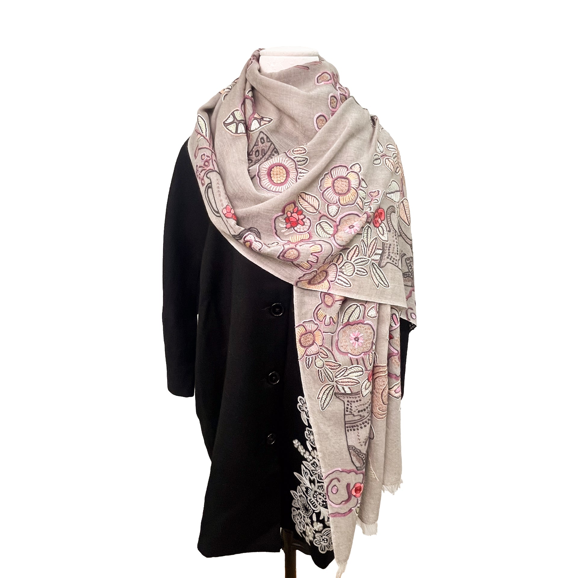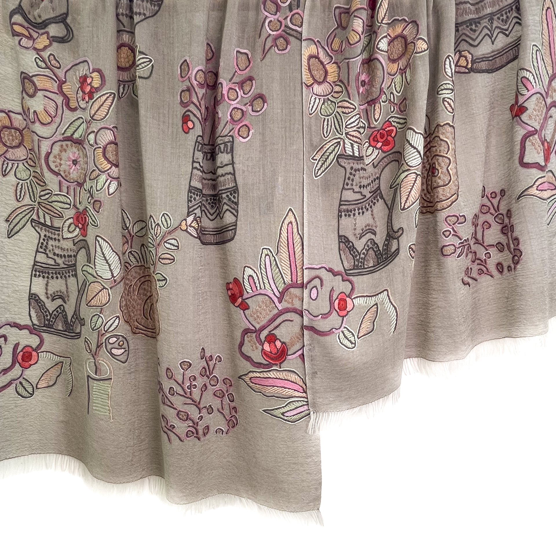 FLOWER POT ウール&シルク アリー手刺繍ストール (グレージュ)