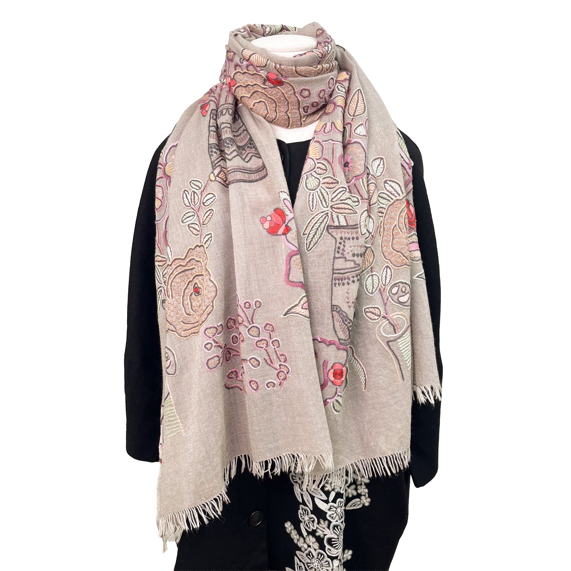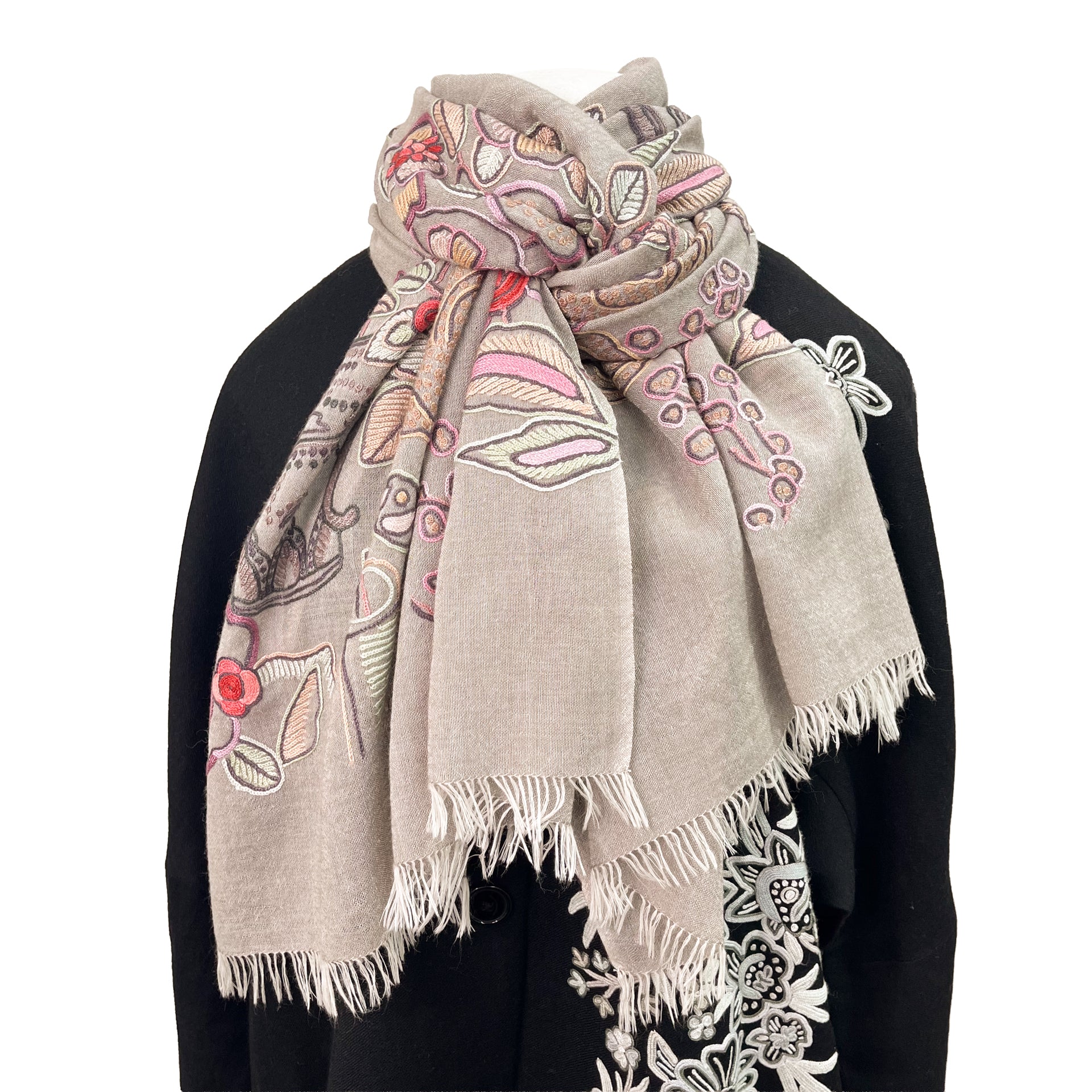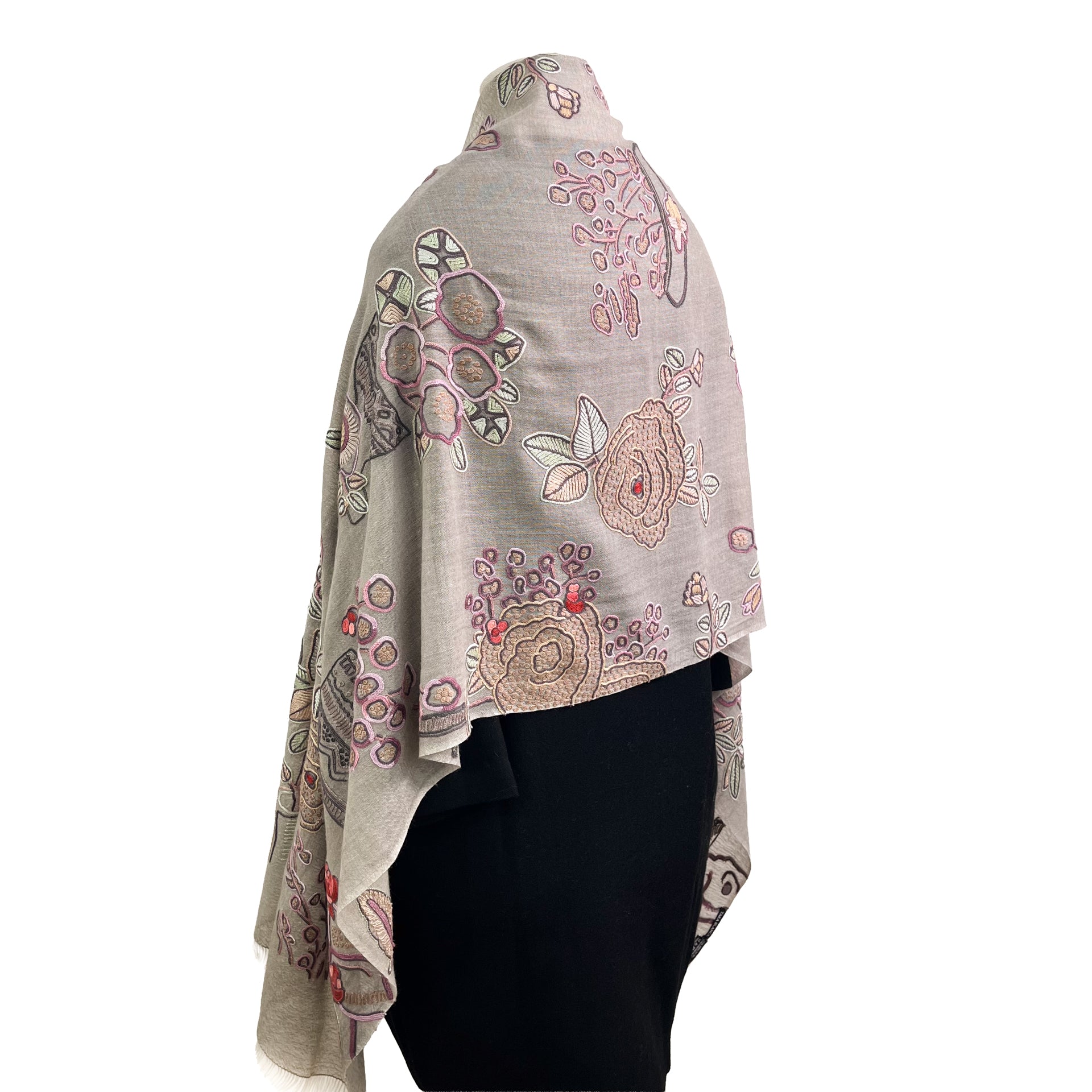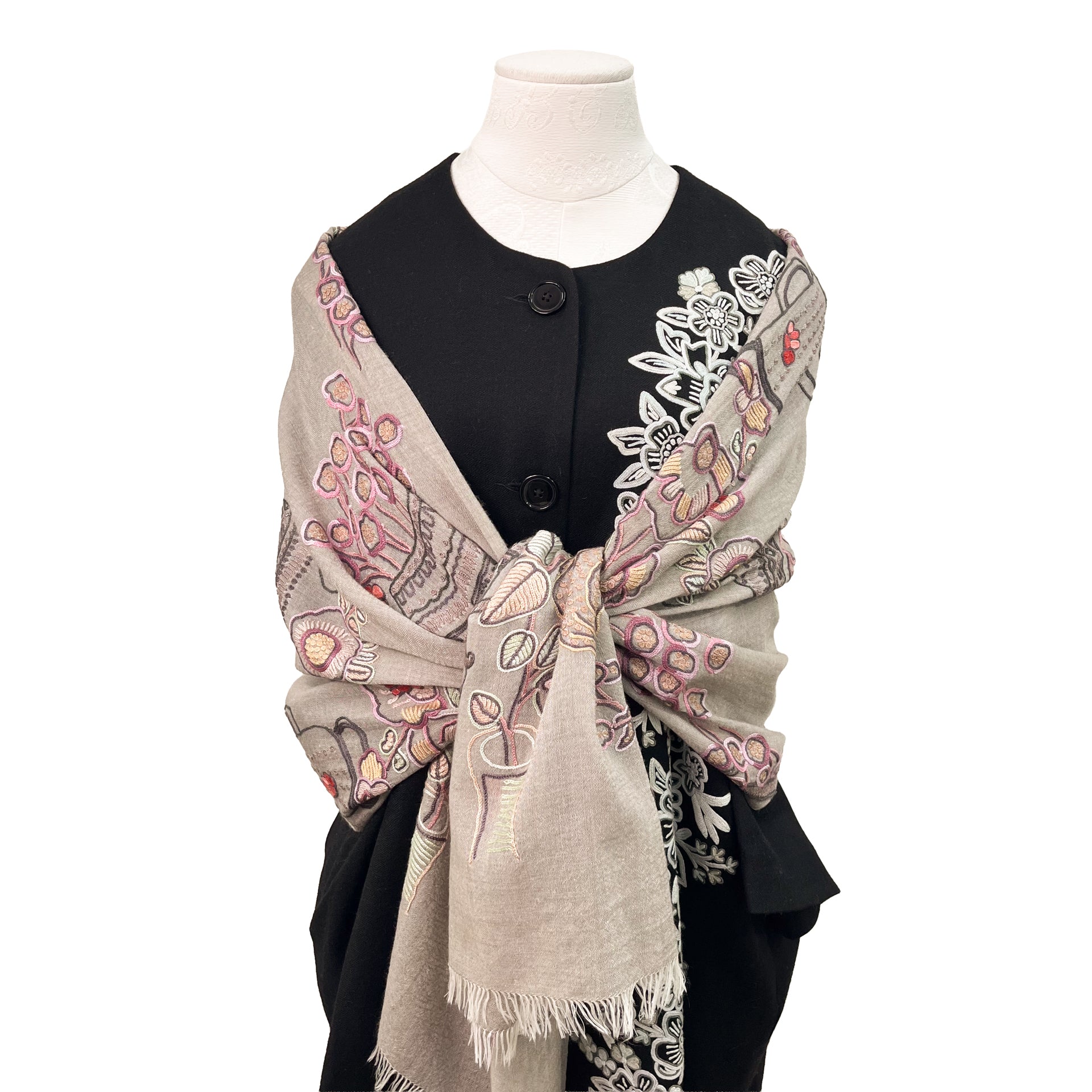 FLOWER POT ウール&シルク アリー手刺繍ストール (グレージュ)
