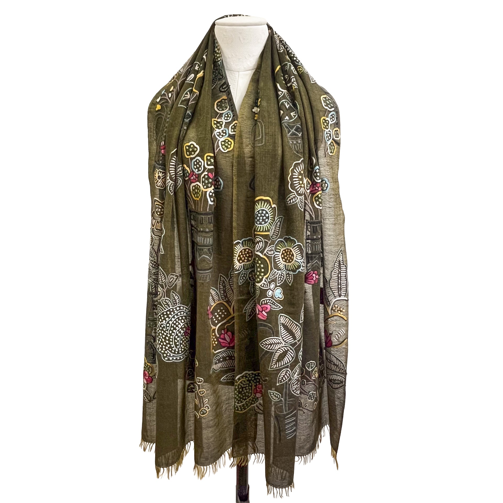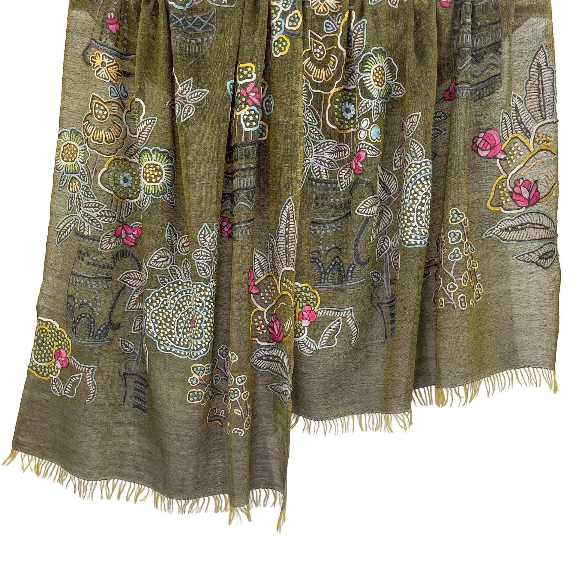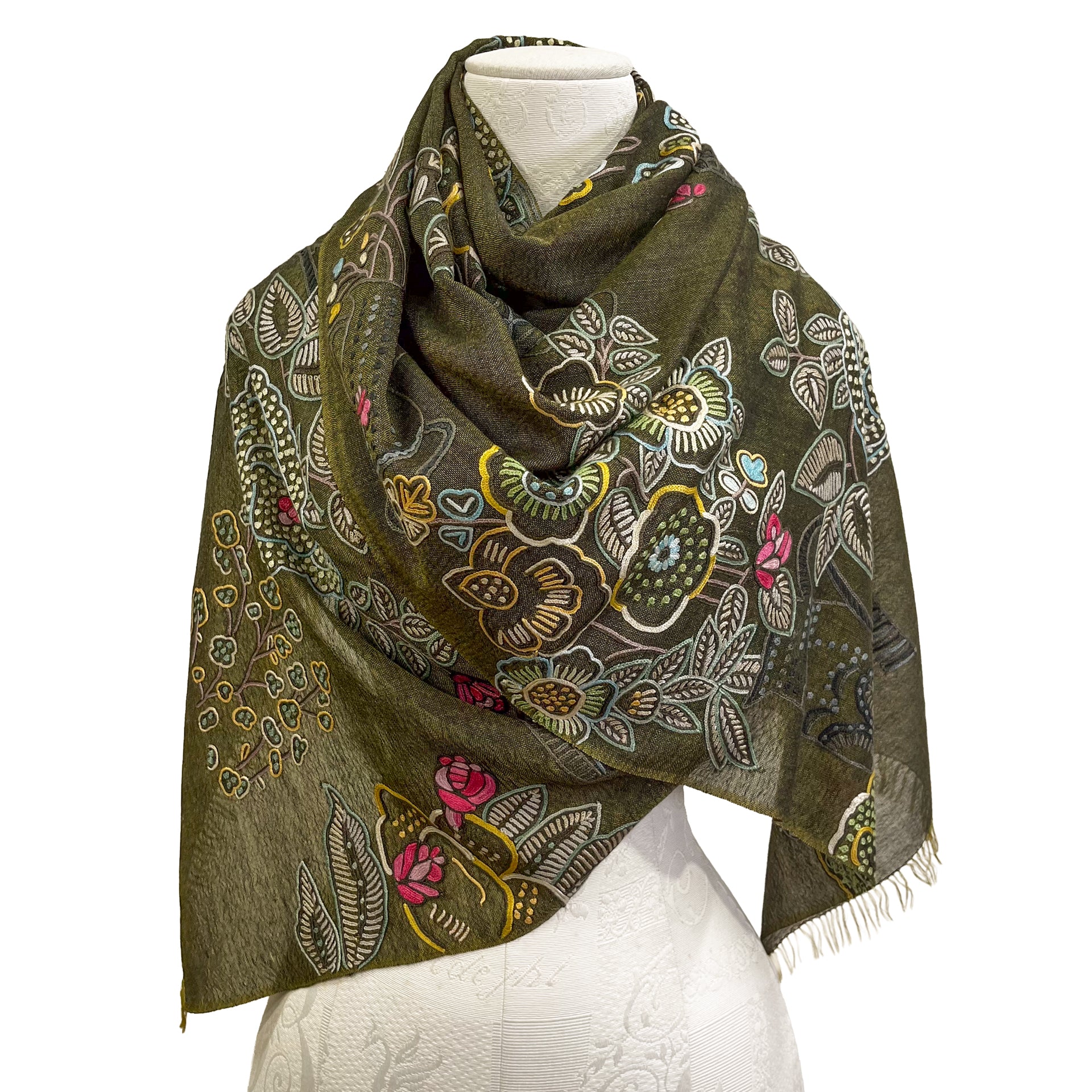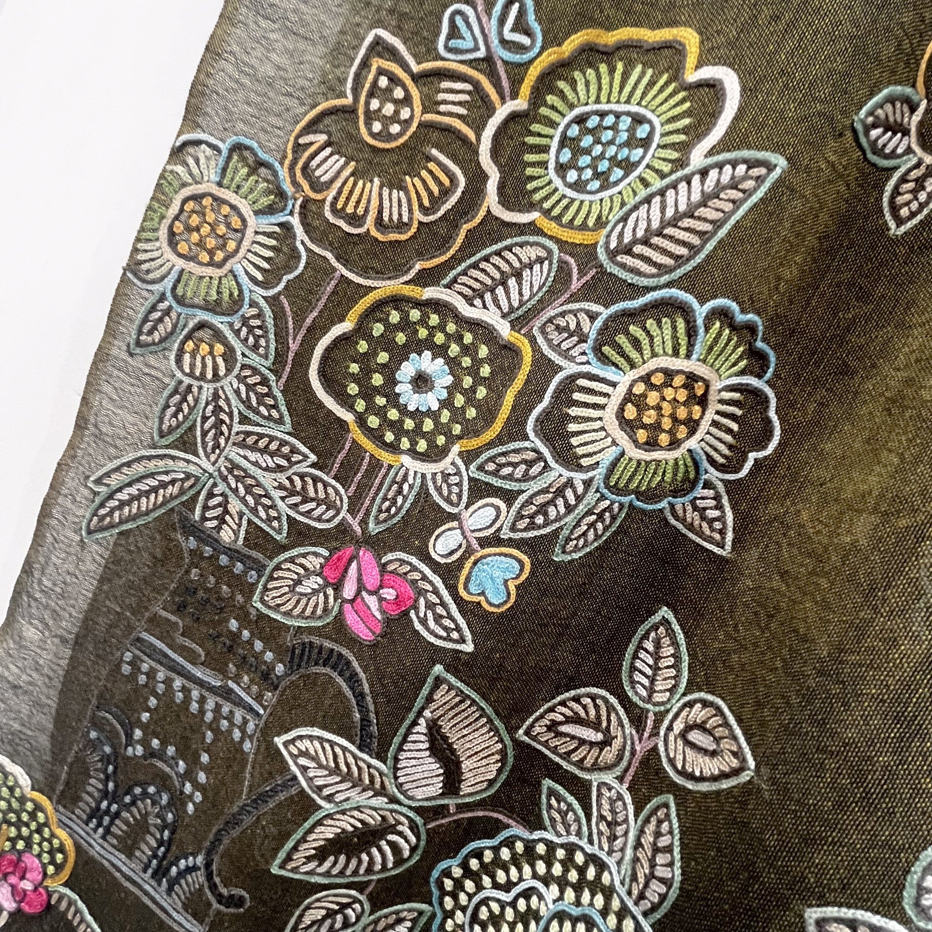 FLOWER POT ウール&シルク アリー手刺繍ストール (ダークカーキ)