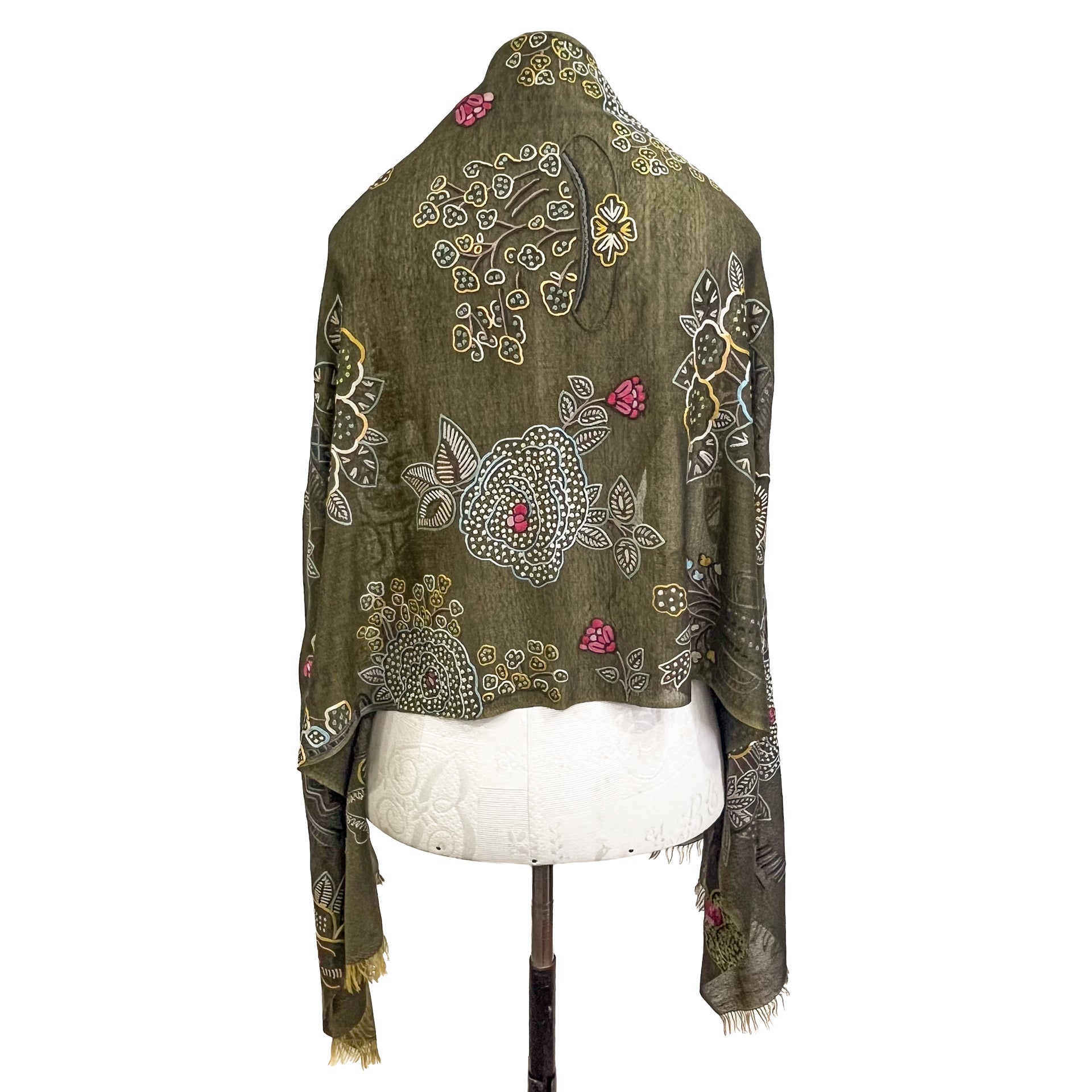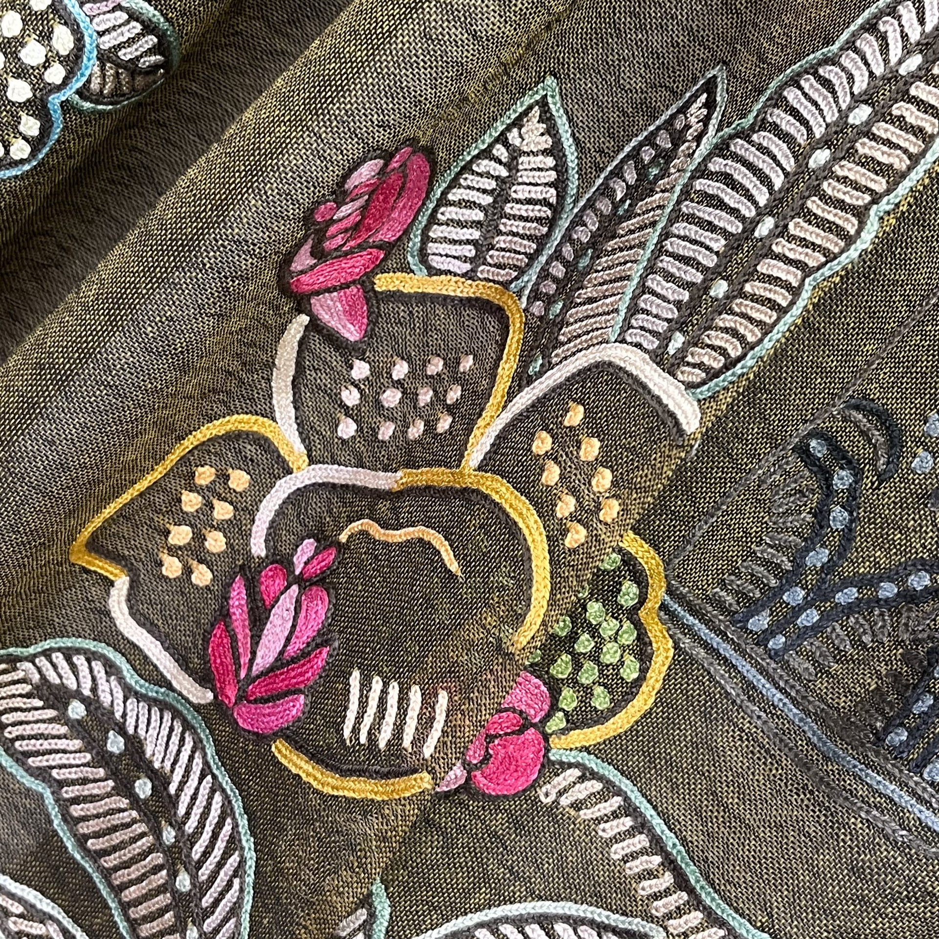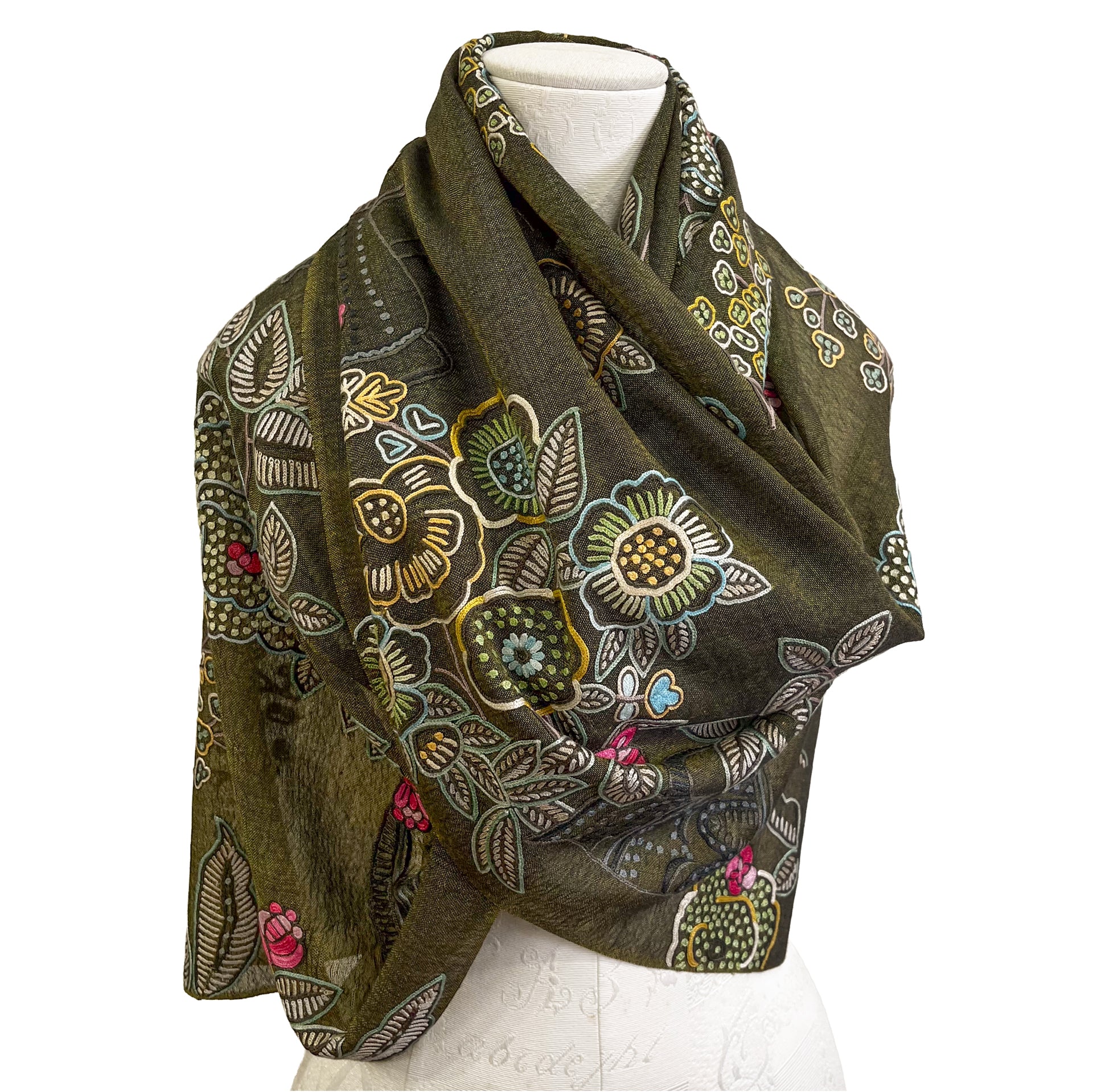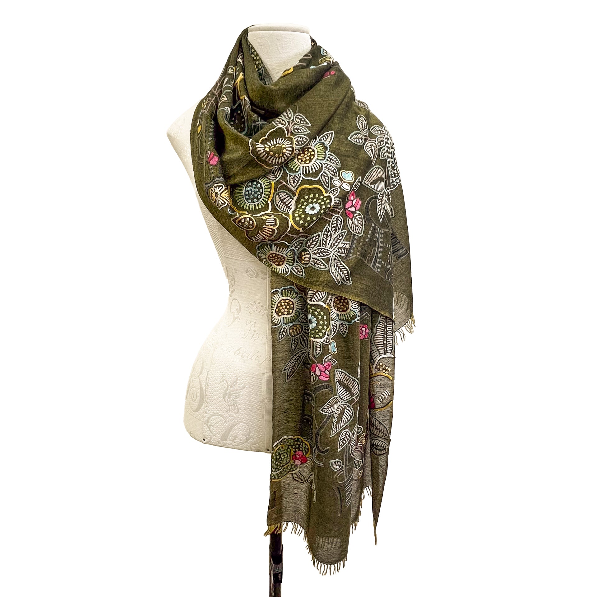 FLOWER POT ウール&シルク アリー手刺繍ストール (ダークカーキ)