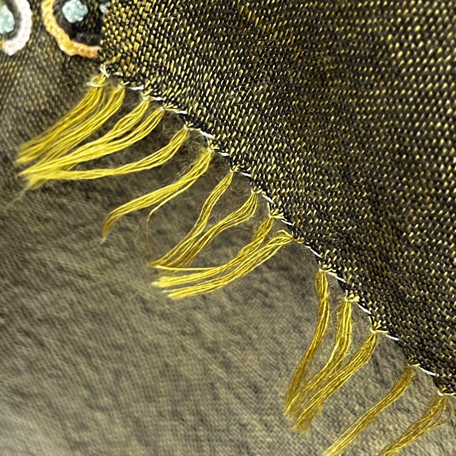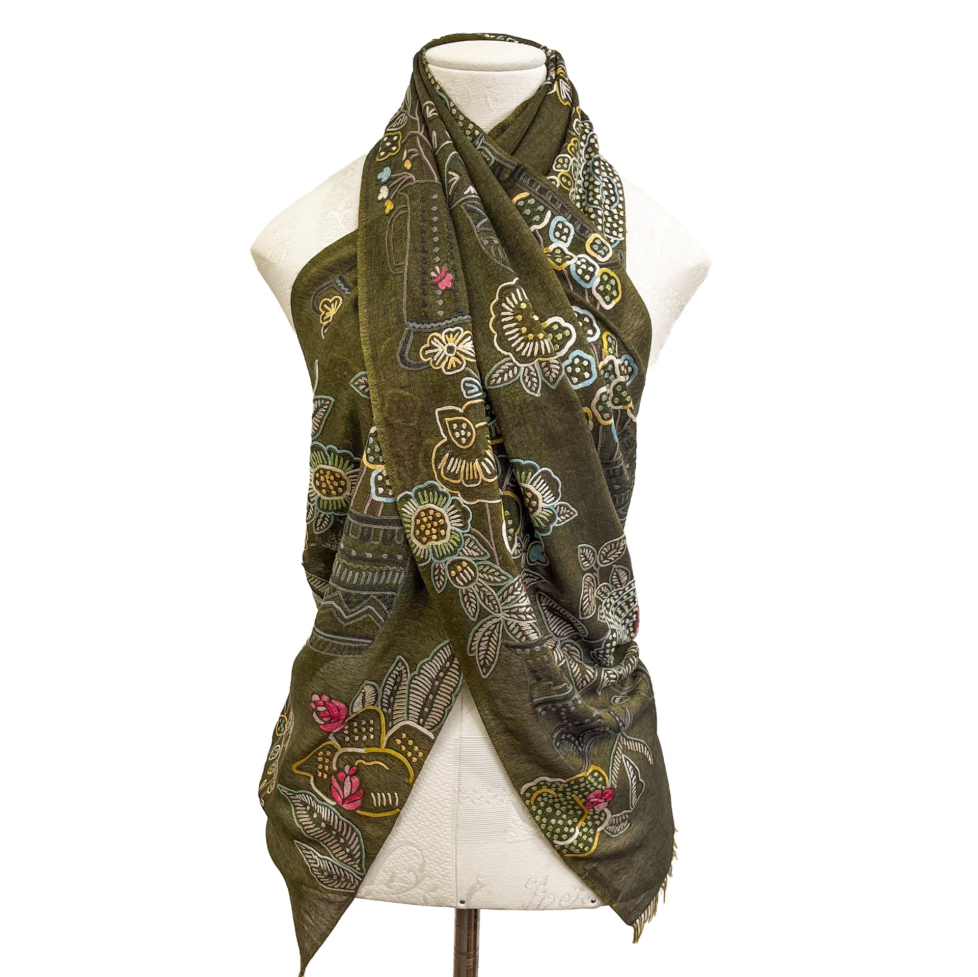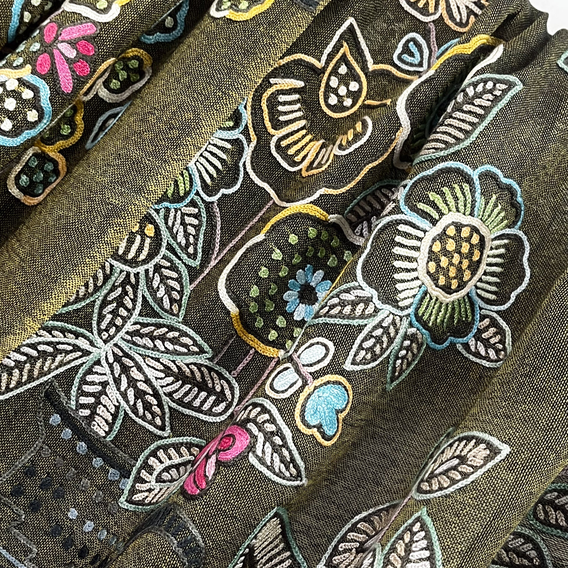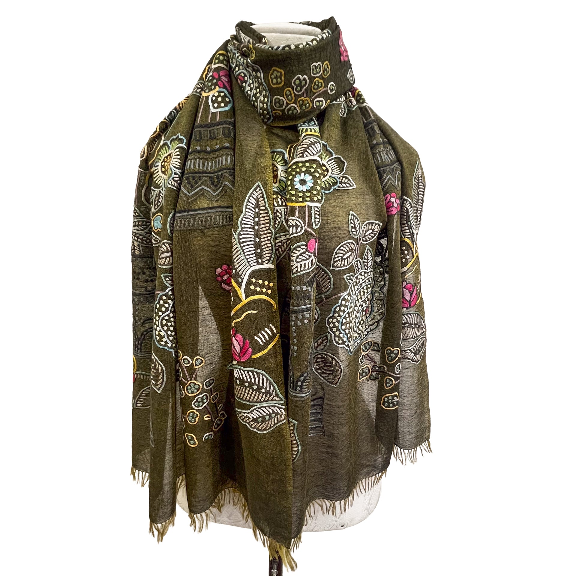 FLOWER POT ウール&シルク アリー手刺繍ストール (ダークカーキ)
