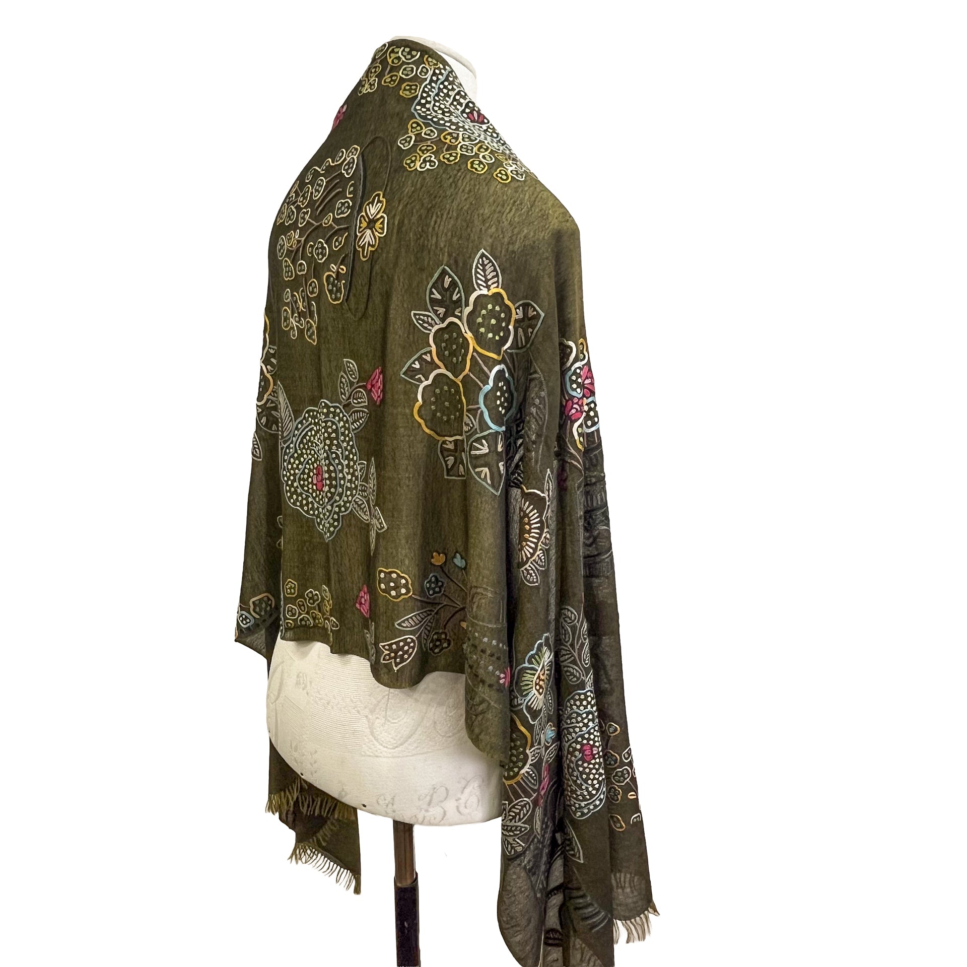 S-WTA5003_0073FLOWER POT ウール&シルク アリー手刺繍ストール (ダークカーキ)