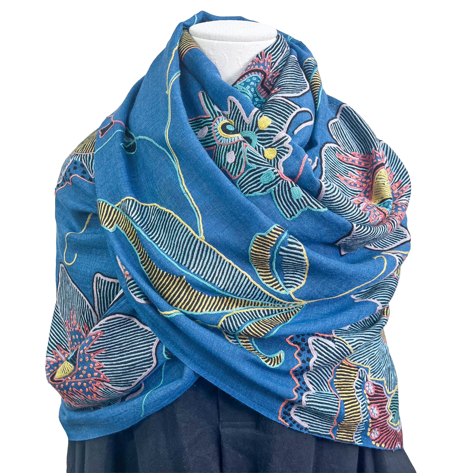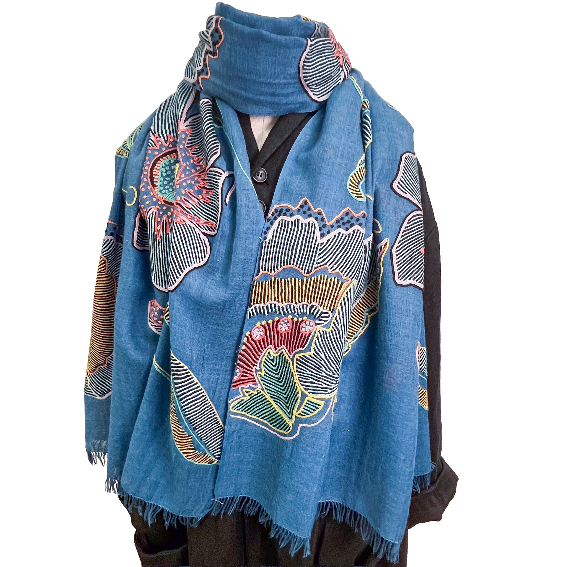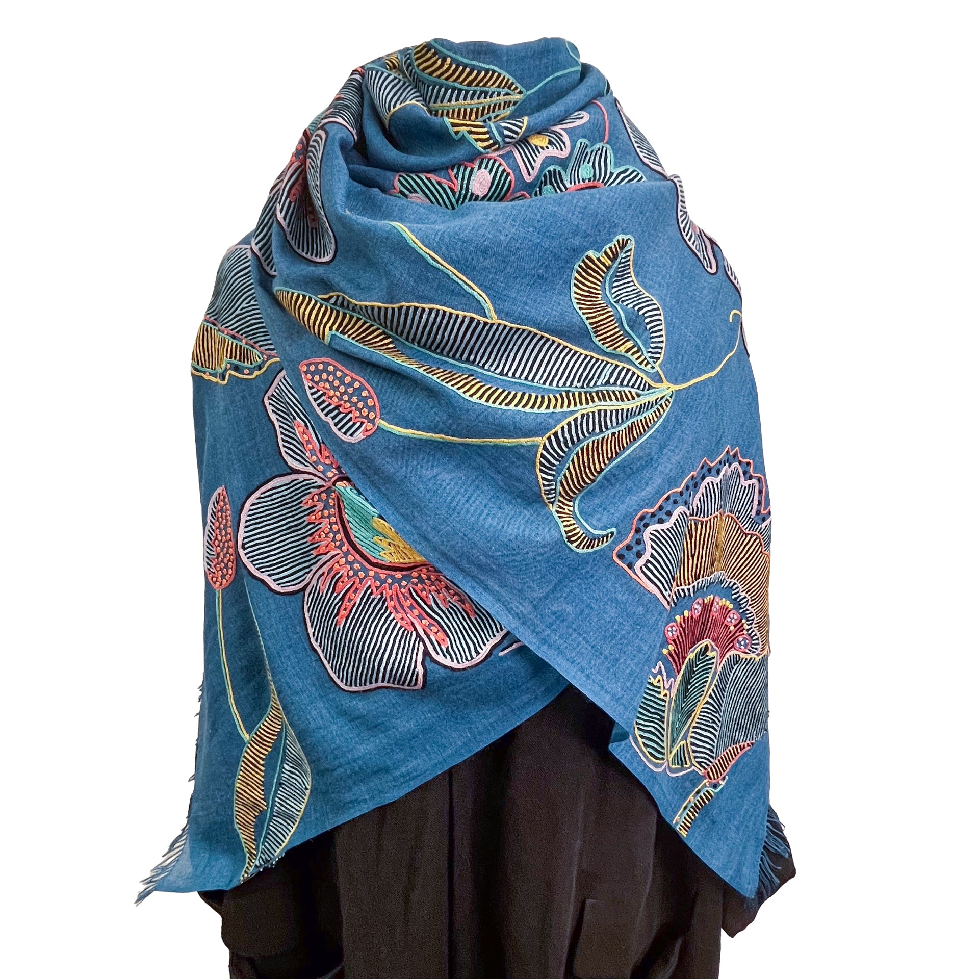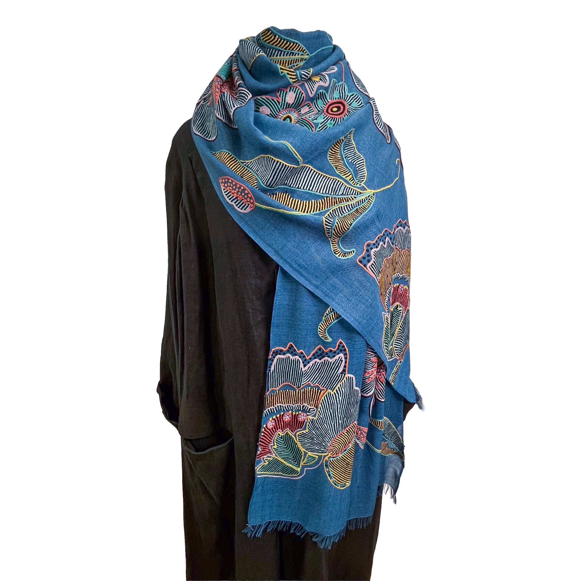 Fusion Flowers ウール&シルク アリー手刺繍ストール (ターコイズ)