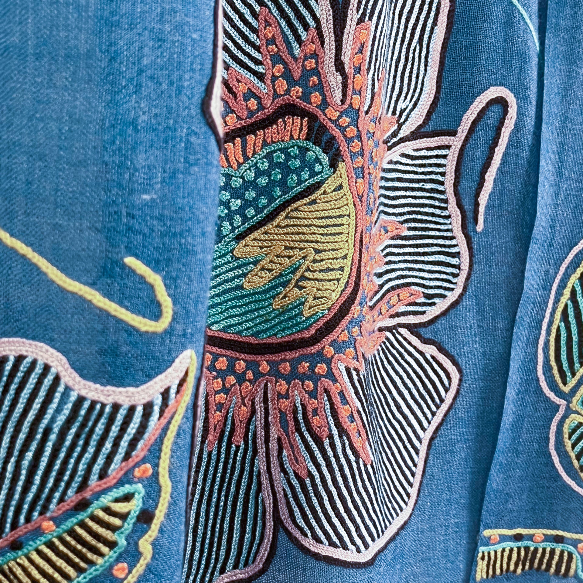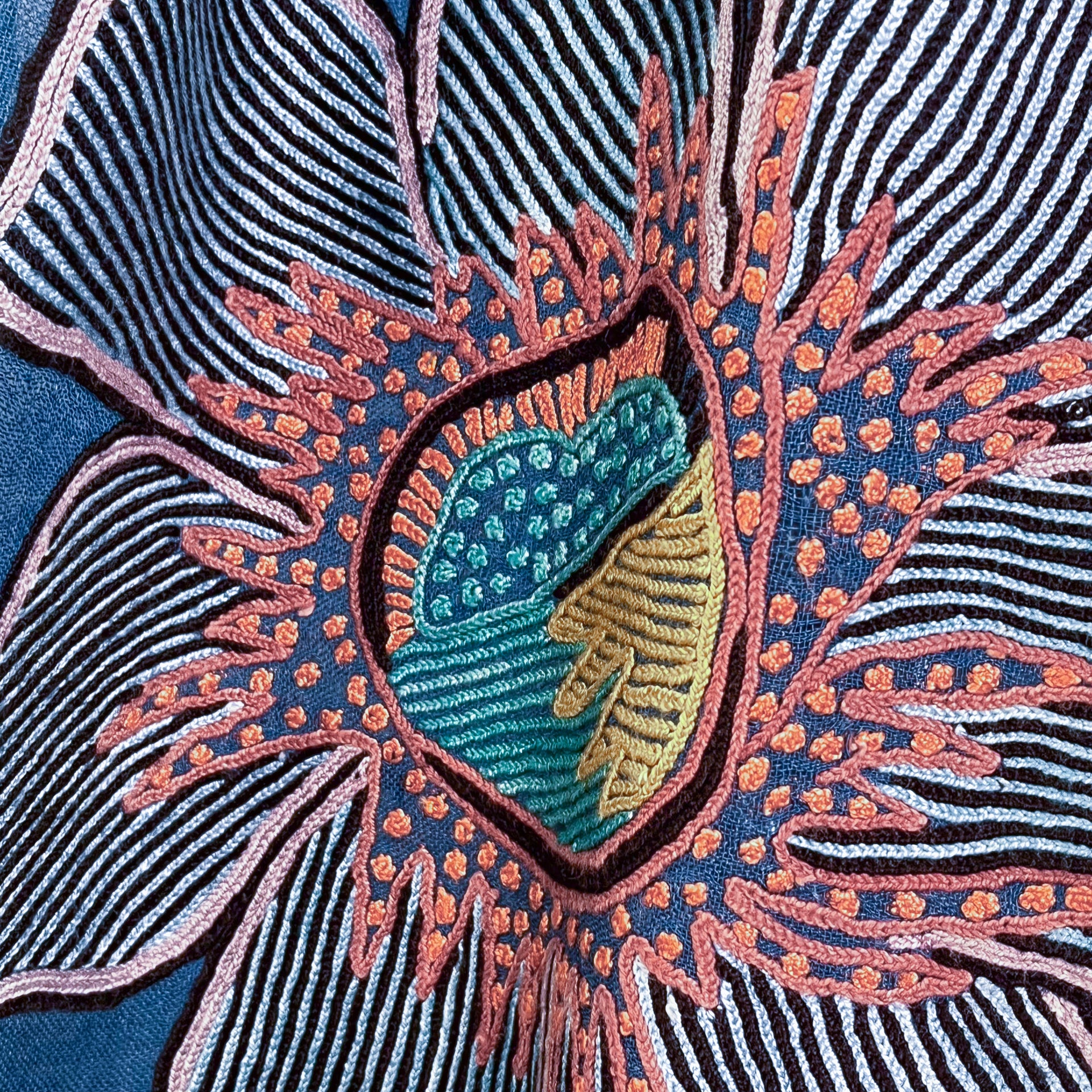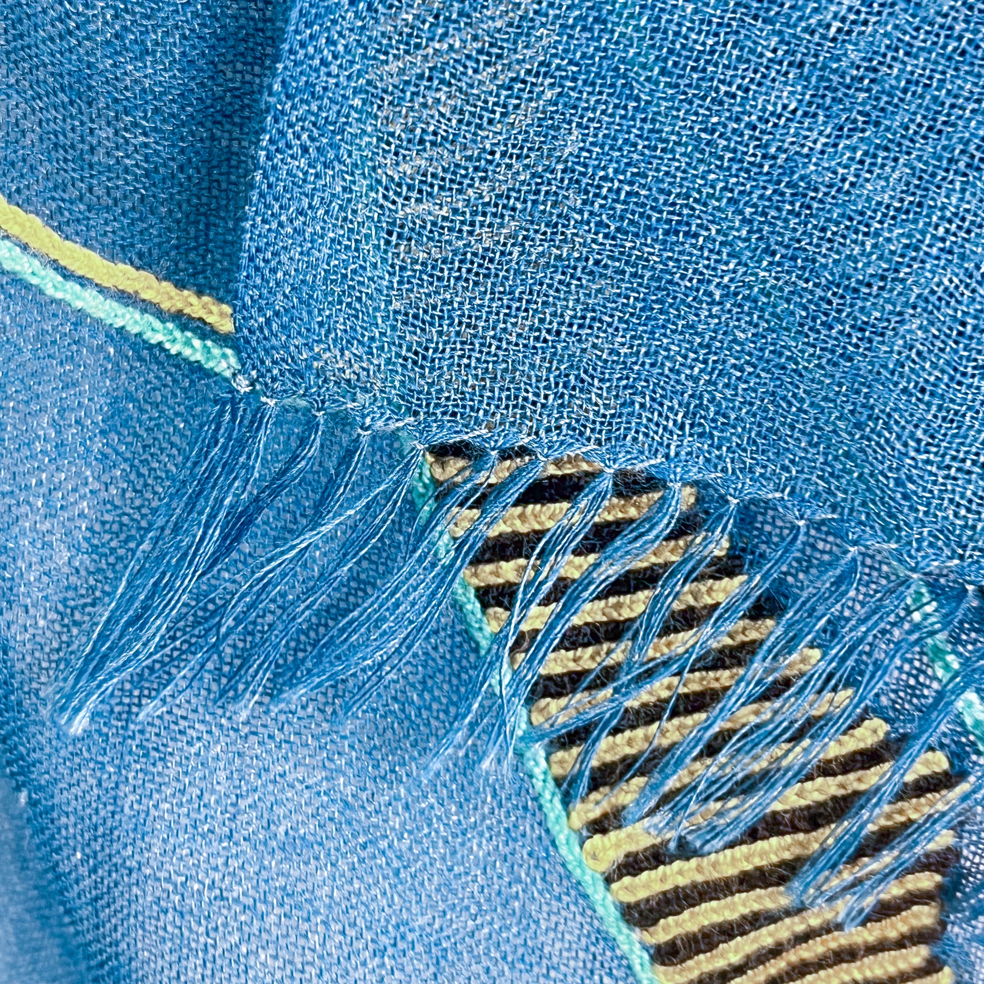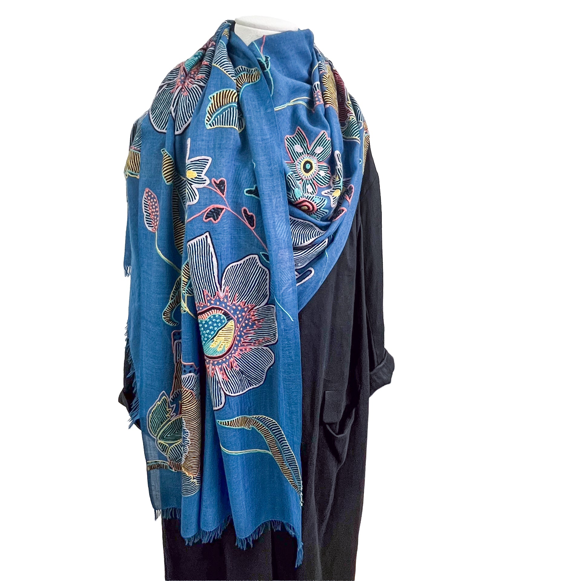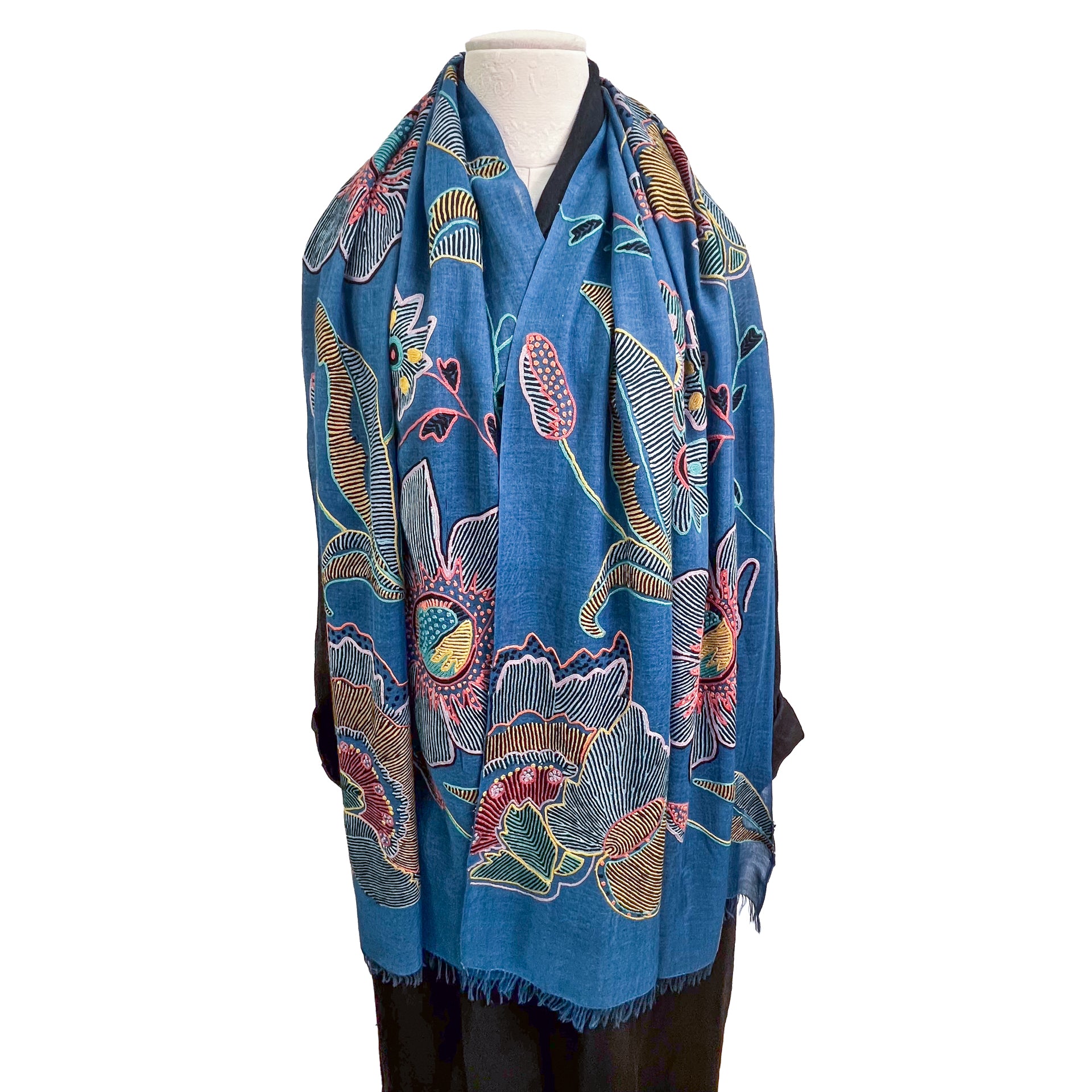 Fusion Flowers ウール&シルク アリー手刺繍ストール (ターコイズ)