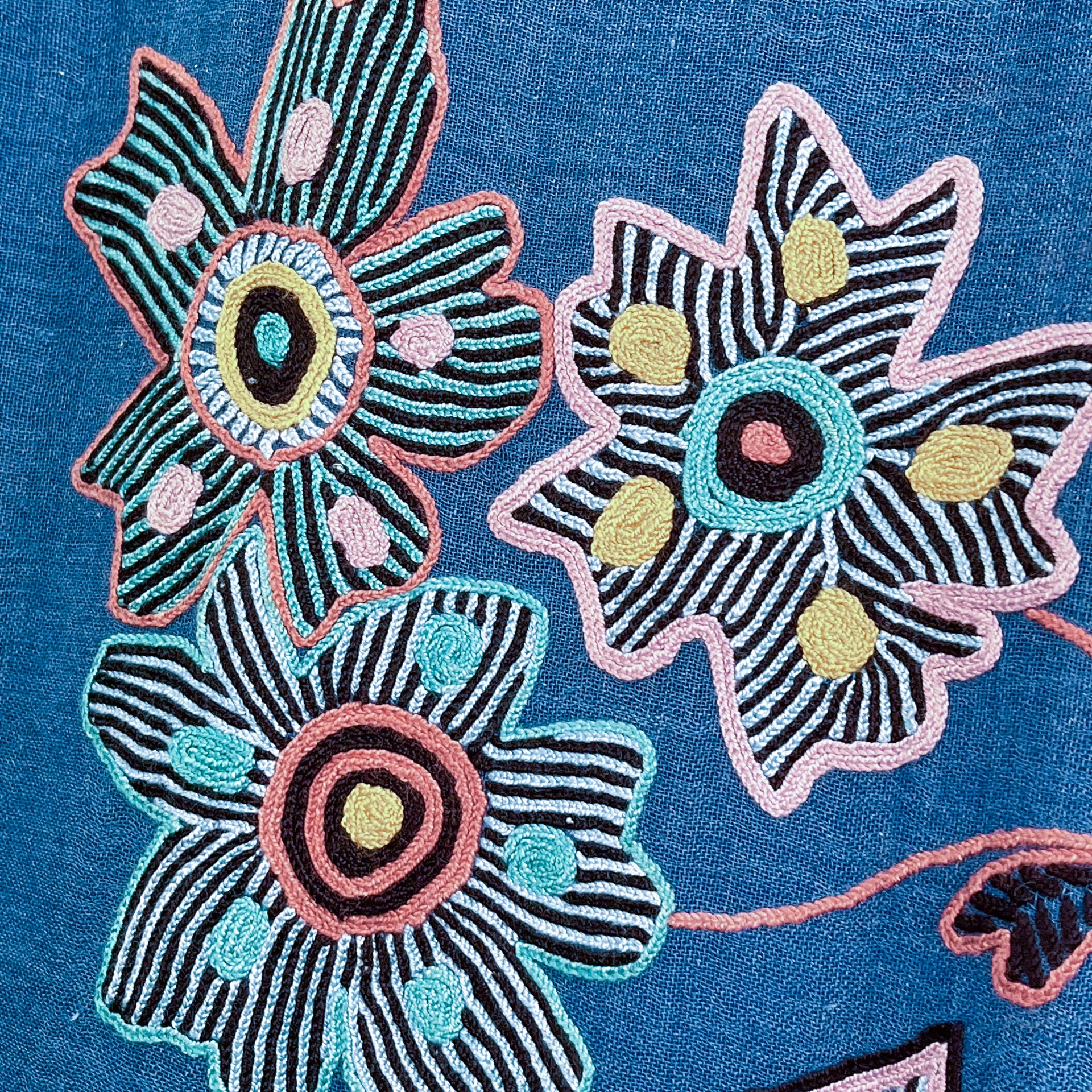 花、湖、山、美しいカシミールの大自然からのインスピレーションを受けたカシミール地方の伝統技術で、細い鉤針を使い下から糸をすくって刺繍します。