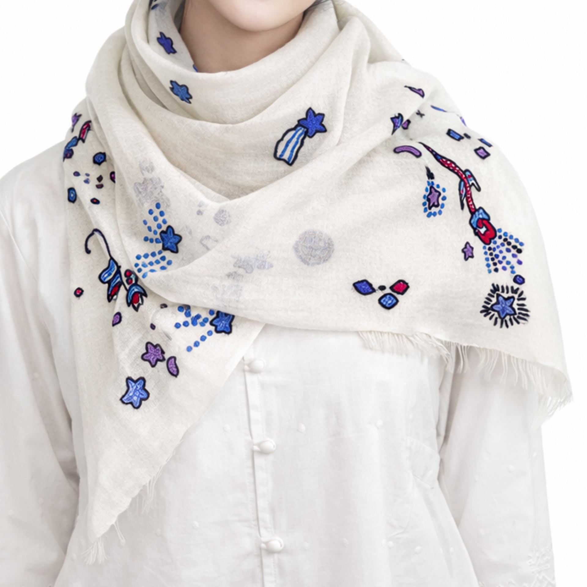 S-WTA9007_0288NEW VIVID FLOWERS薄手ウール&シルク アリー手刺繍ストール (ホワイト/ブルー)