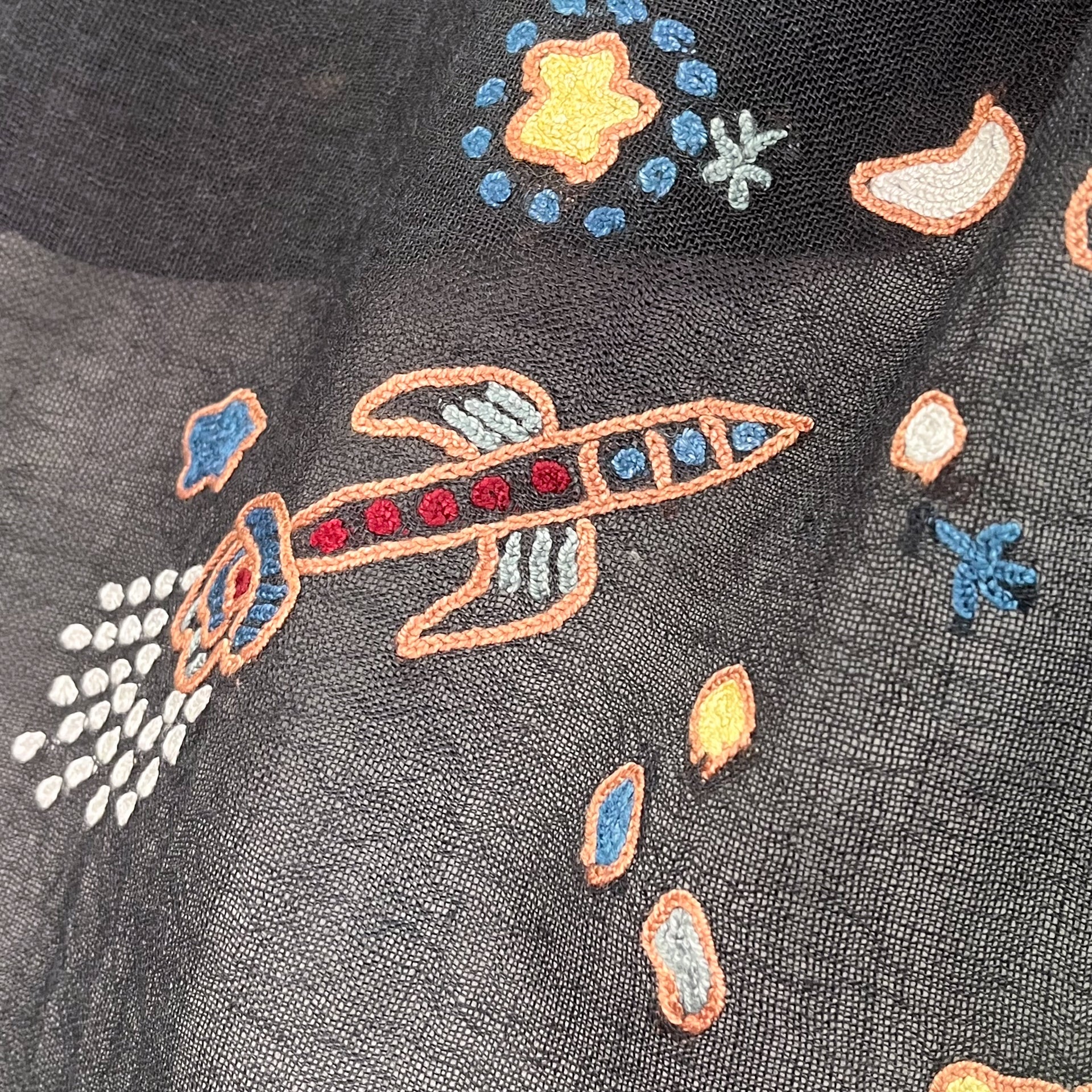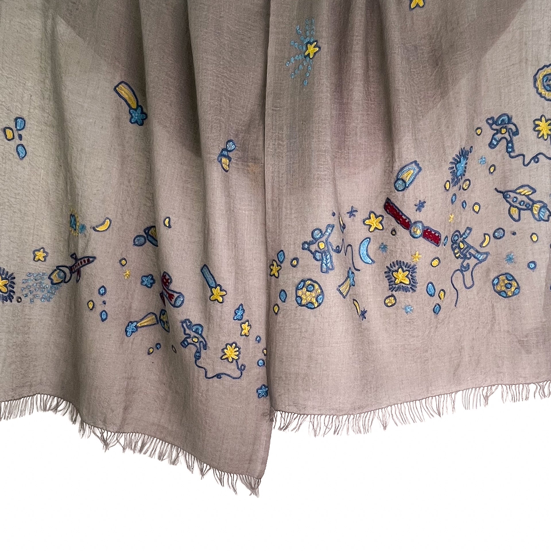 Space Odesseyイギリス人テキスタイルデザイナーが描いた「Space Odessey」宇宙への憧れを小さなモチーフにして散りばめました。小さな楽しいモチーフを、インドの職人がアリー手刺繍をひと針ひと針施しました。