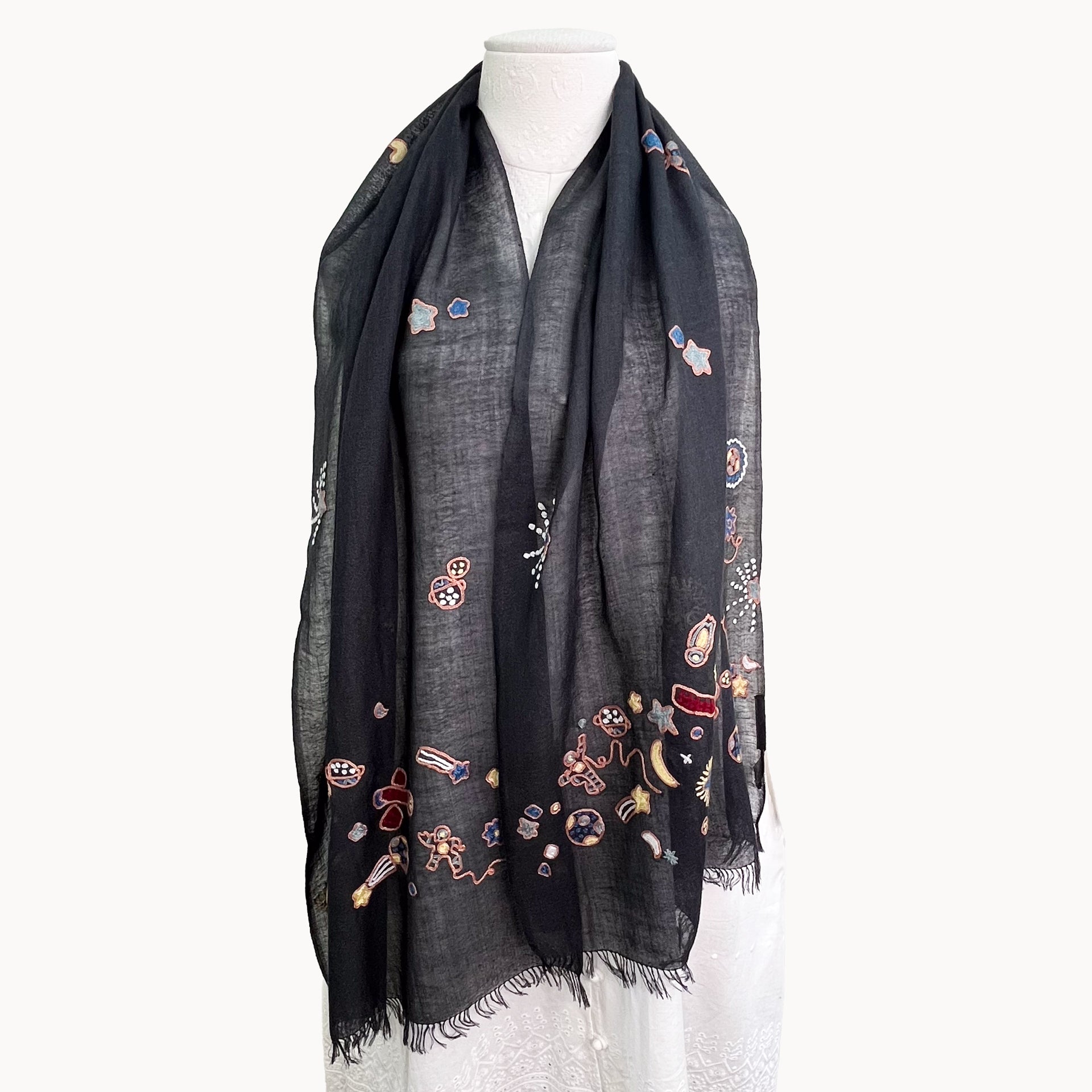 Space Odessey 薄手ウール&シルク アリー手刺繍細幅ストール